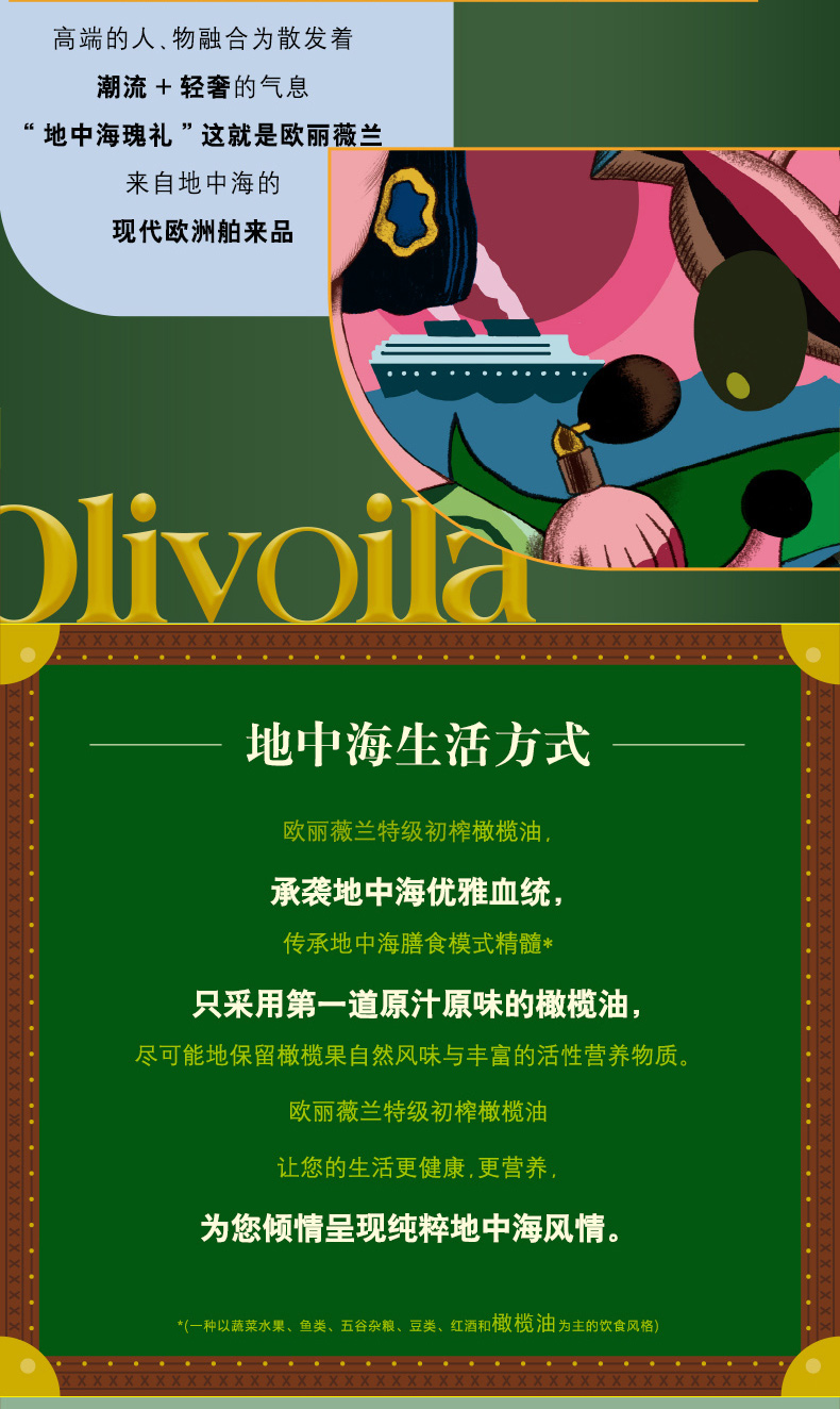 欧丽薇兰Olivoilà是意大利的食用油品牌,国内由上海嘉里食品工业有限公司代理销售。曾是2018年纽约国际橄榄油比赛金奖得主,由谢霆锋代言,是谢霆锋在《十二道锋味》中的厨房绝杀技。