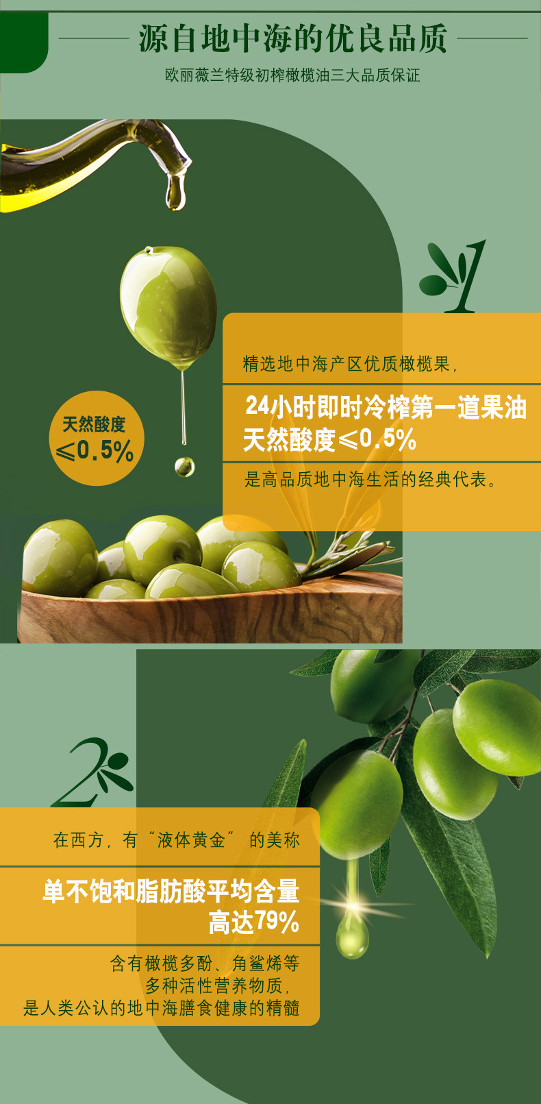 欧丽薇兰橄榄油采用地中海产区橄榄果为原料,采摘后24小时内冷榨而成,单不饱和脂肪酸含量79%。天然橄榄中的多配含量高达400ppm (毫克/千克),长期食用有利于人体健康。