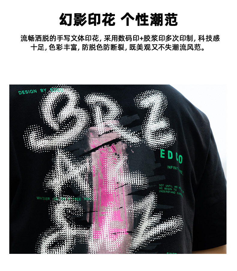 这款艾德克EDCO的赛博朋克幻影印花T恤,中性款男女都可穿。面料是100%新疆精梳棉,柔软亲肤吸湿。