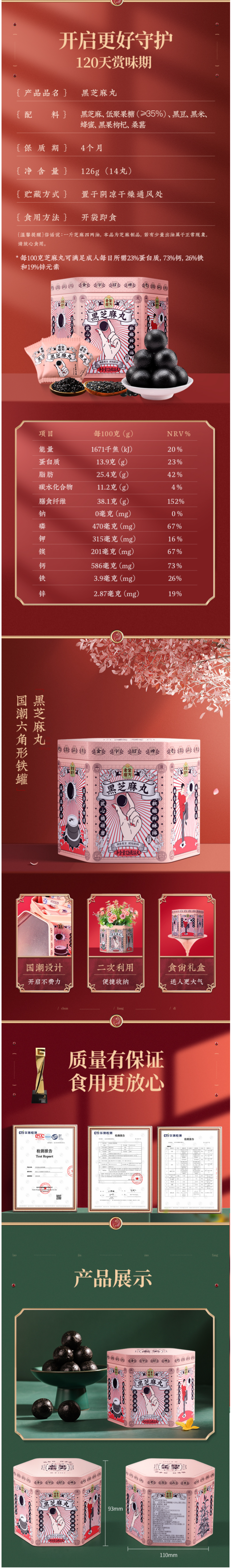 选用当季黑芝麻,颗粒饱满,干净无杂质,香脆美味,清洗后高温烤制需要把握精准的火候;用蜂蜜代替糖调制蜜丸,口感稍甜却不腻,蜂蜜清润细腻,不粘牙。单颗独立包装,充氮保鲜。