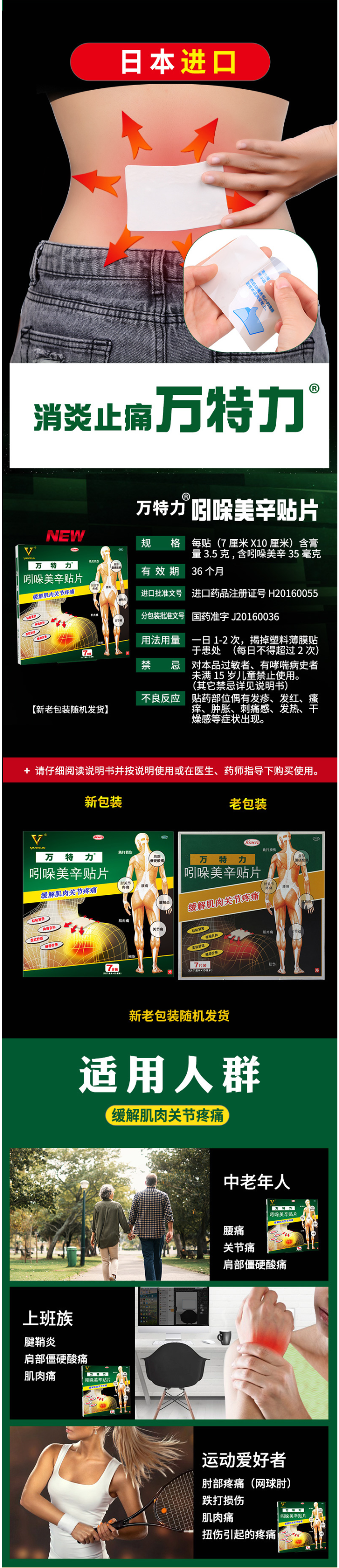 这款万特力吲哚美辛贴片,日本进口,正规的OTC进口药品,产品是非处方类药品,可放心使用,其功能主治腰痛、关节痛、肌肉痛、腱鞘炎、跌打损伤、肩部僵硬酸痛、扭伤等引起的疼痛,外用消炎镇痛,效果显著。
