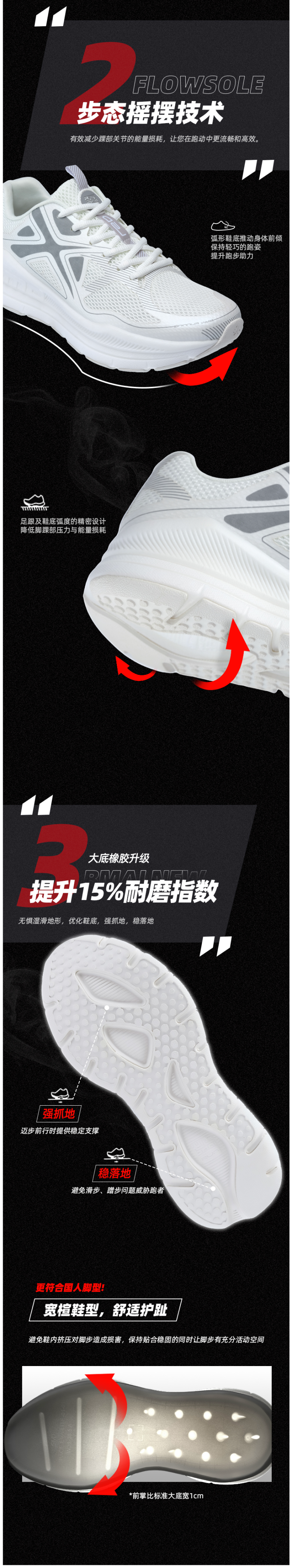 运用了Flowsole步态摇摆技术,有效减少踝部关节的能量损耗,在跑步过程中更流畅和高效。升级橡胶大底,提升了15%耐磨指数,优化了鞋底的抓地和稳定支撑性,无惧湿滑地形,