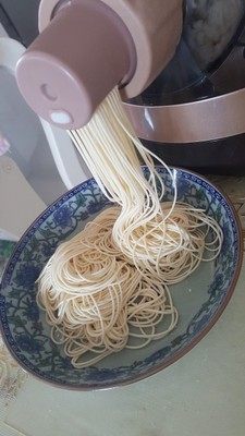 随机器会附赠量杯,按照说明书定量配比面和水的比例,先和成棉絮状,然后挤压成面条,操作起来非常简单,面条也很筋道,附上面条机实图。