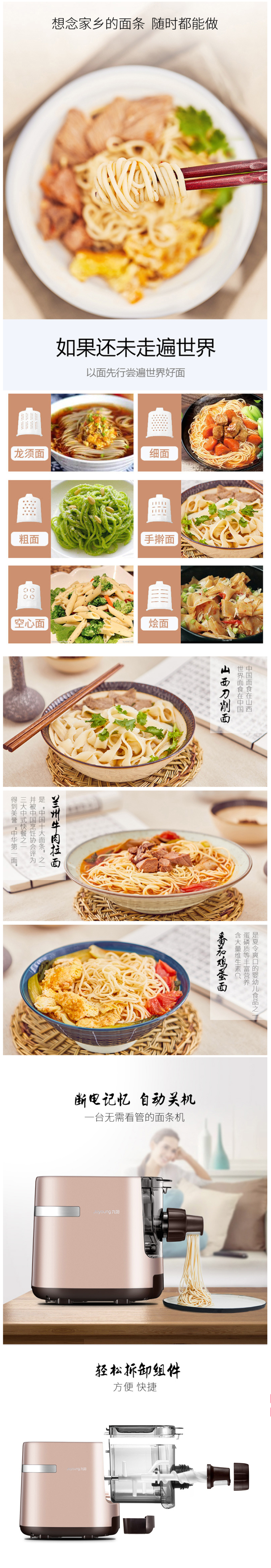 SMART CHIP智能芯管控制技术,自动调节和面时间和速度,还有断电记忆功能;立体三维和面杆,仿手工耐心揉压,加上三段螺旋挤压,制作出来的面条更劲道;配有6种模具头,可做细面、粗面、龙须面、手擀面、空心面、烩面,尺寸是375*200*275mm。