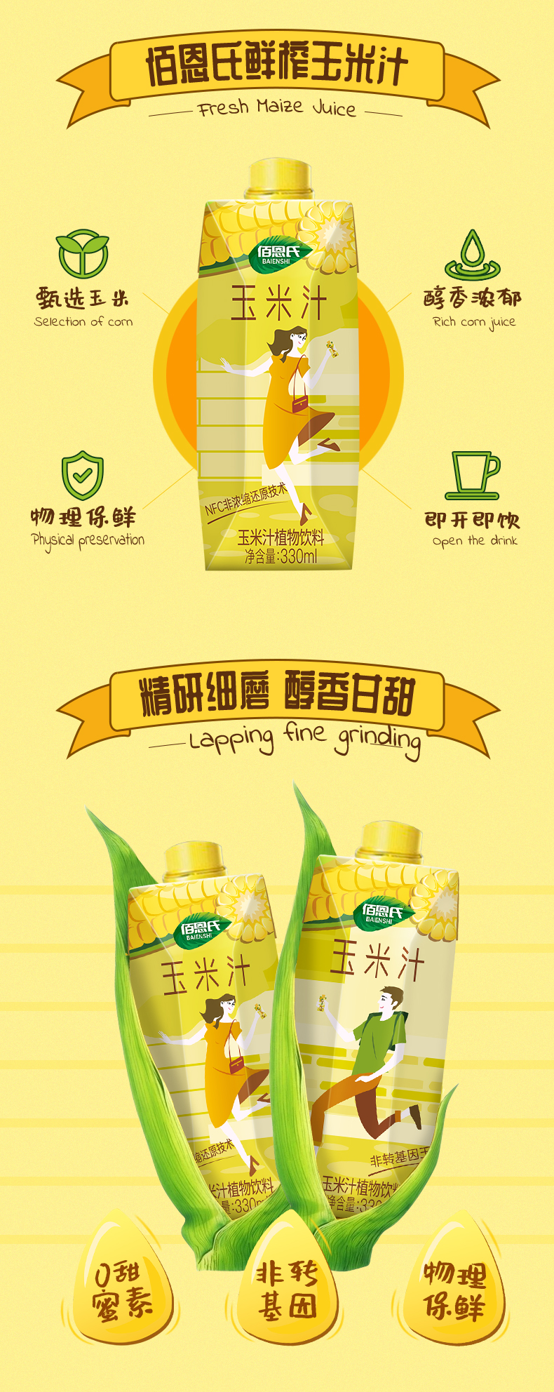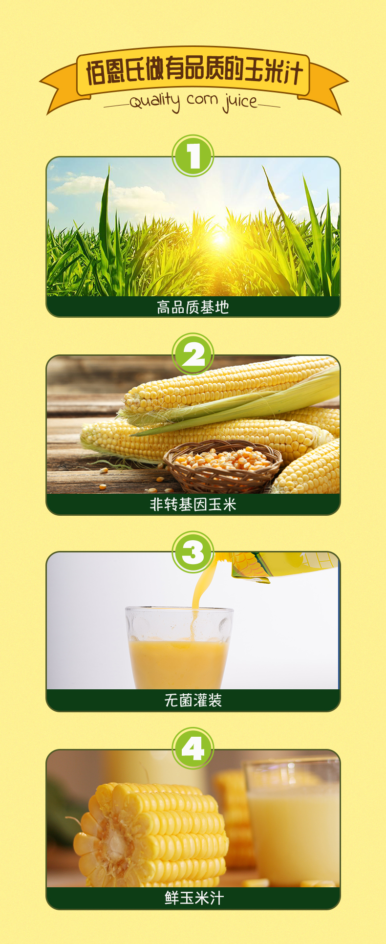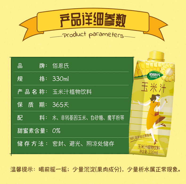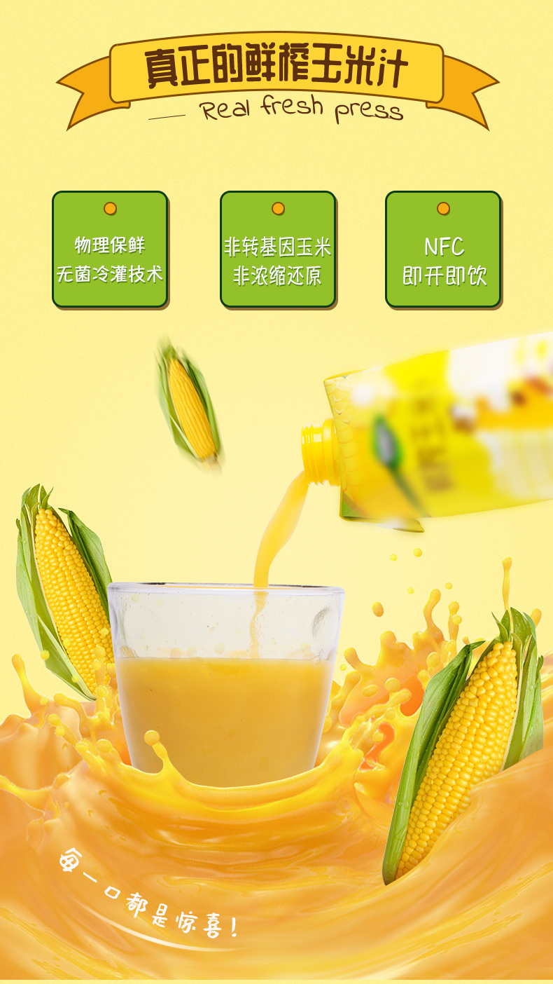 这款佰恩氏 NFC玉米汁采用优质非转基因水果玉米,原生态有机种植,无农药残留,纯物理压榨,原汁原味,保留玉米的清香润滑,口感细腻香甜,回味无穷,无香精、色素和防腐剂,饮用健康安全。