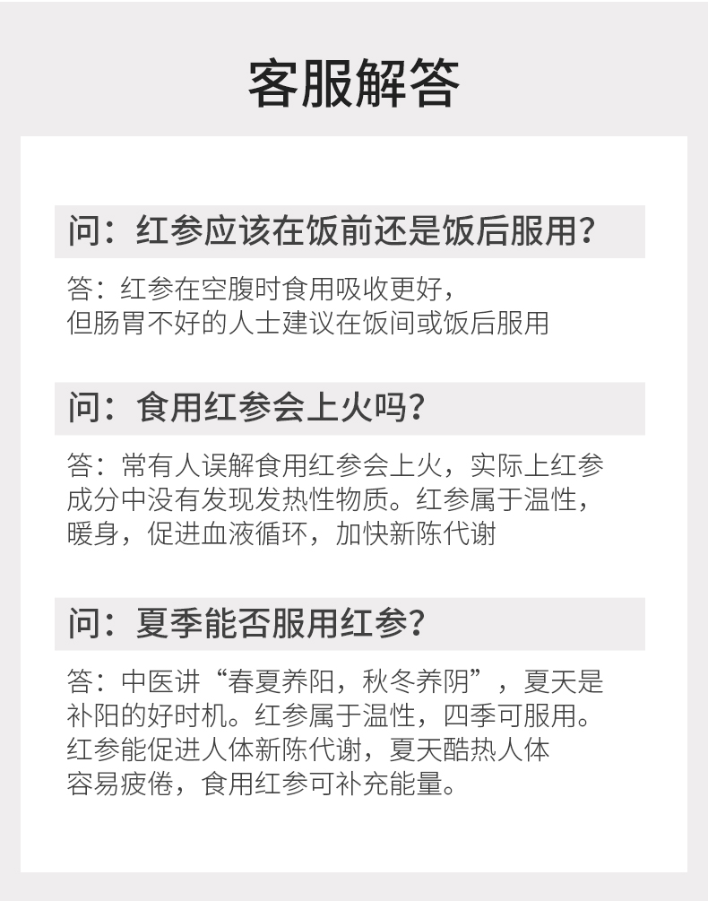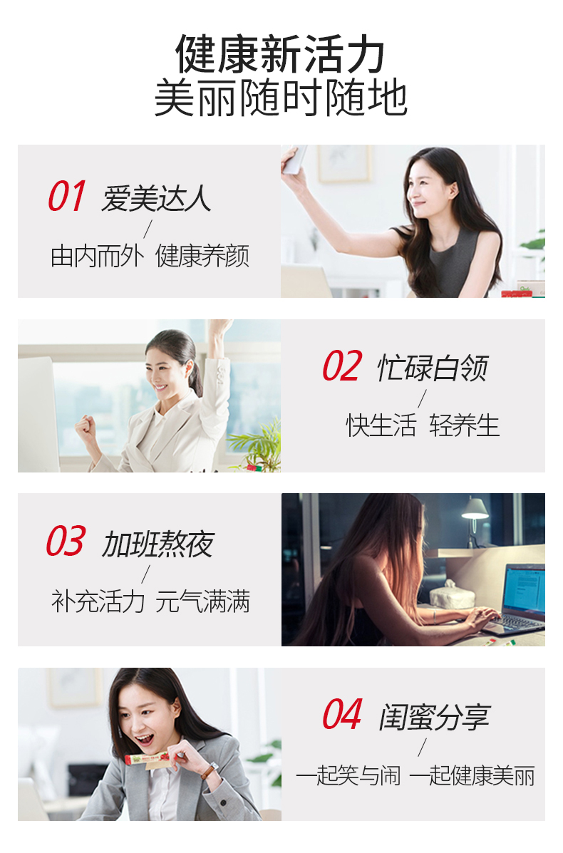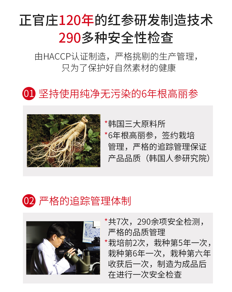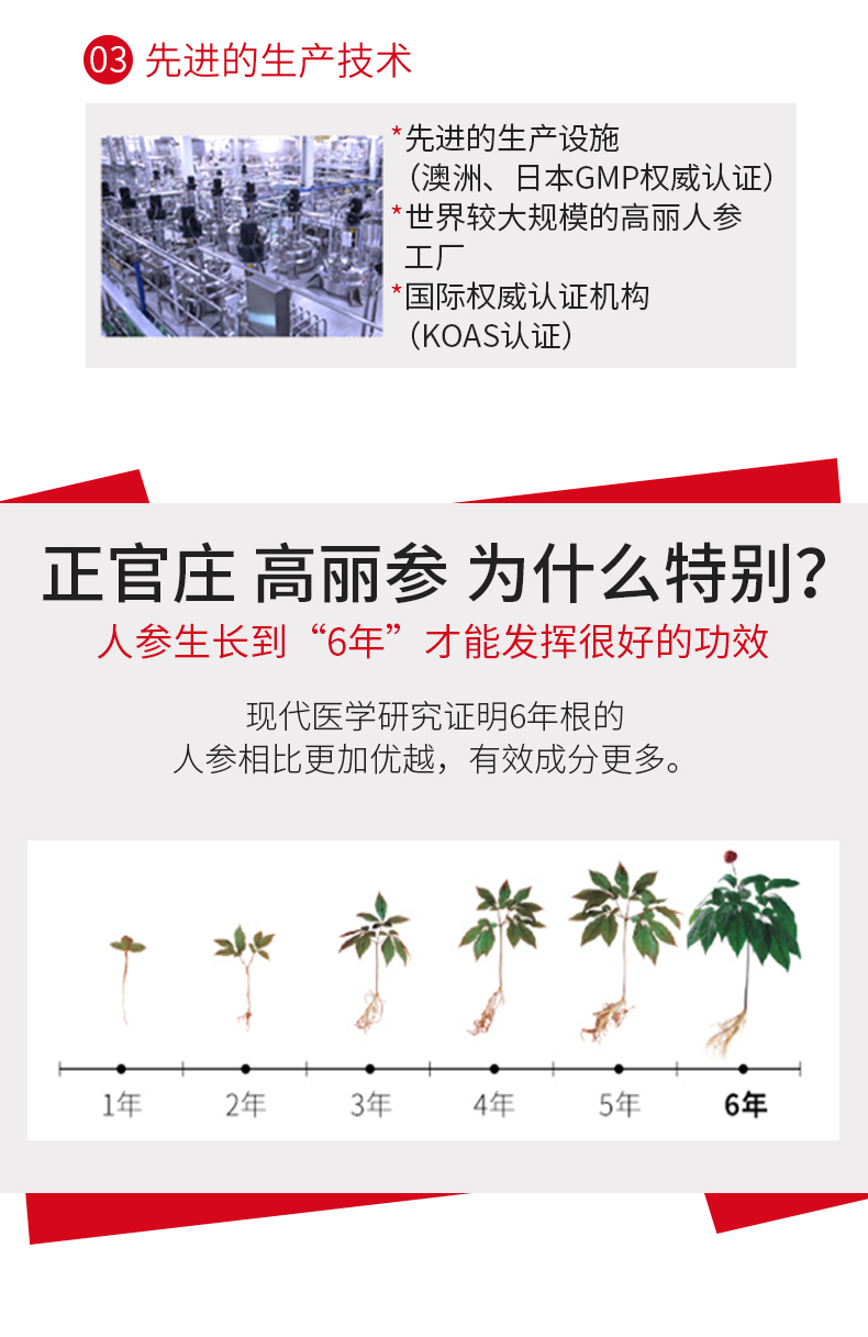 红参:采用采用6年根高丽根高丽人参,富含32种皂苷,采用超微细粉末技术及发酵红参制造技术,强化皂苷含量、提高吸收率,有助于增强血液循环,改善疲劳,增强免疫力。
