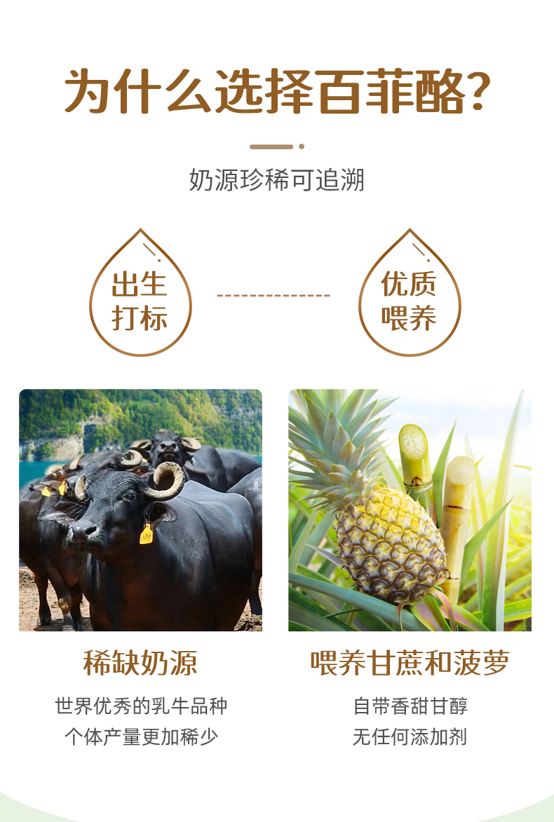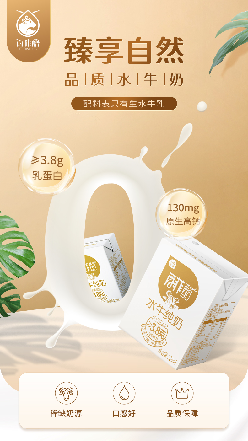 水牛纯奶是普通奶牛产量的1/4,双倍的营养,1/5的胆固醇,再加上比普通牛奶更多的蛋白质、钙、氨基酸和微量元素等,绝对的奶中珍品!