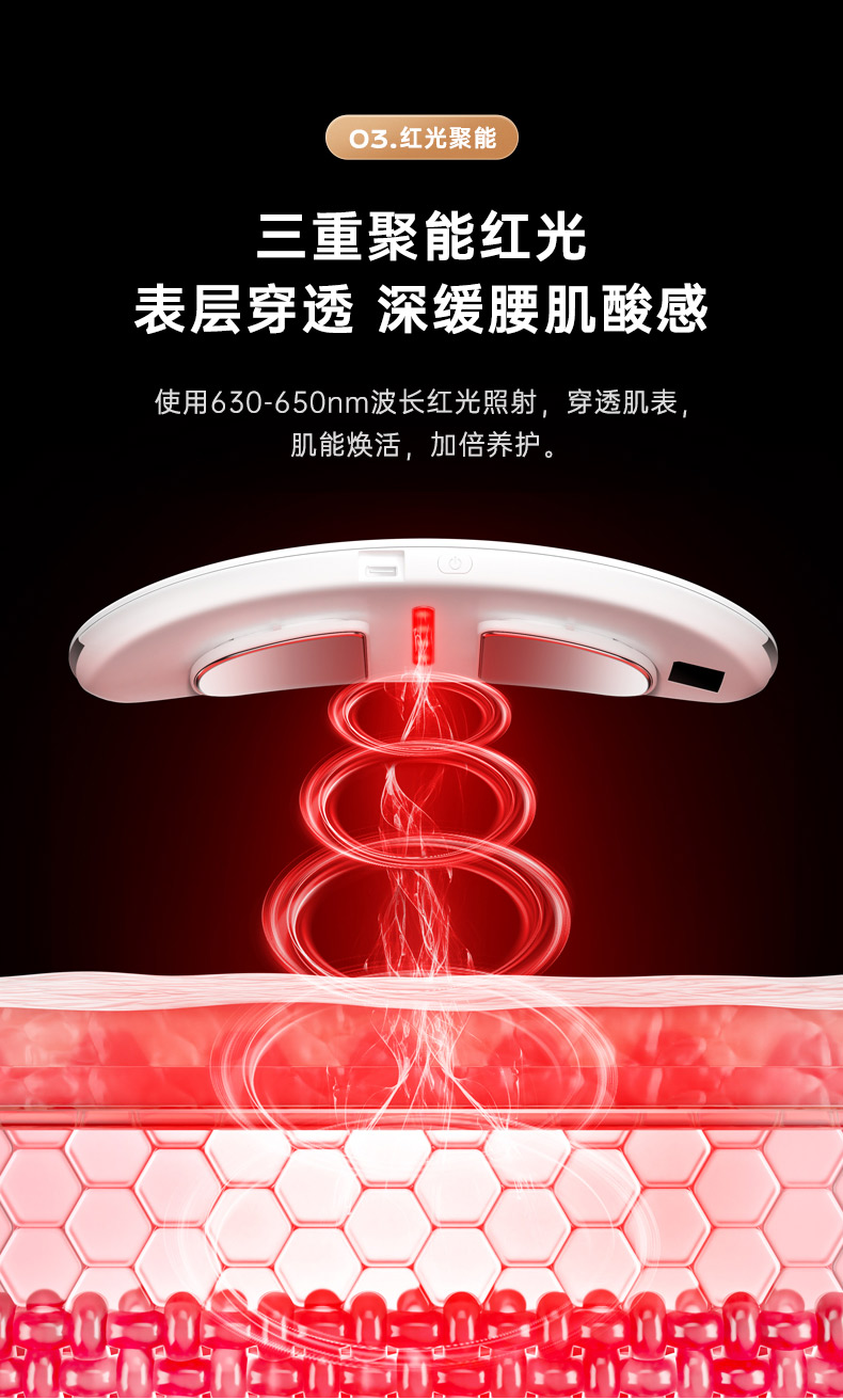 红光照射:深入皮下组织10-15mm,按摩更深入、更到位