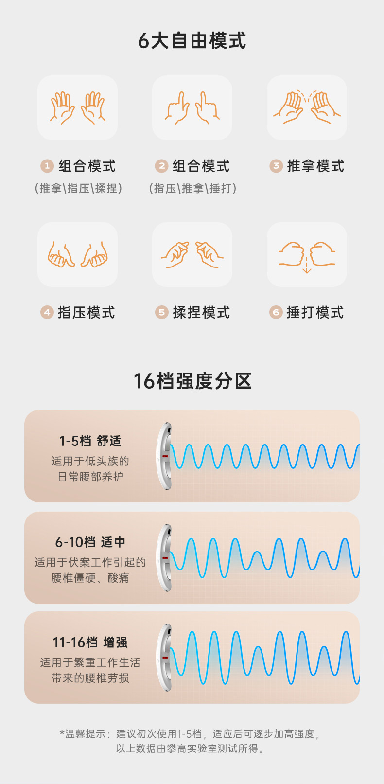 仿真按摩:推拿、指压、揉捏、捶打模拟多种手法,16档强度随意适配,满足不同需求。