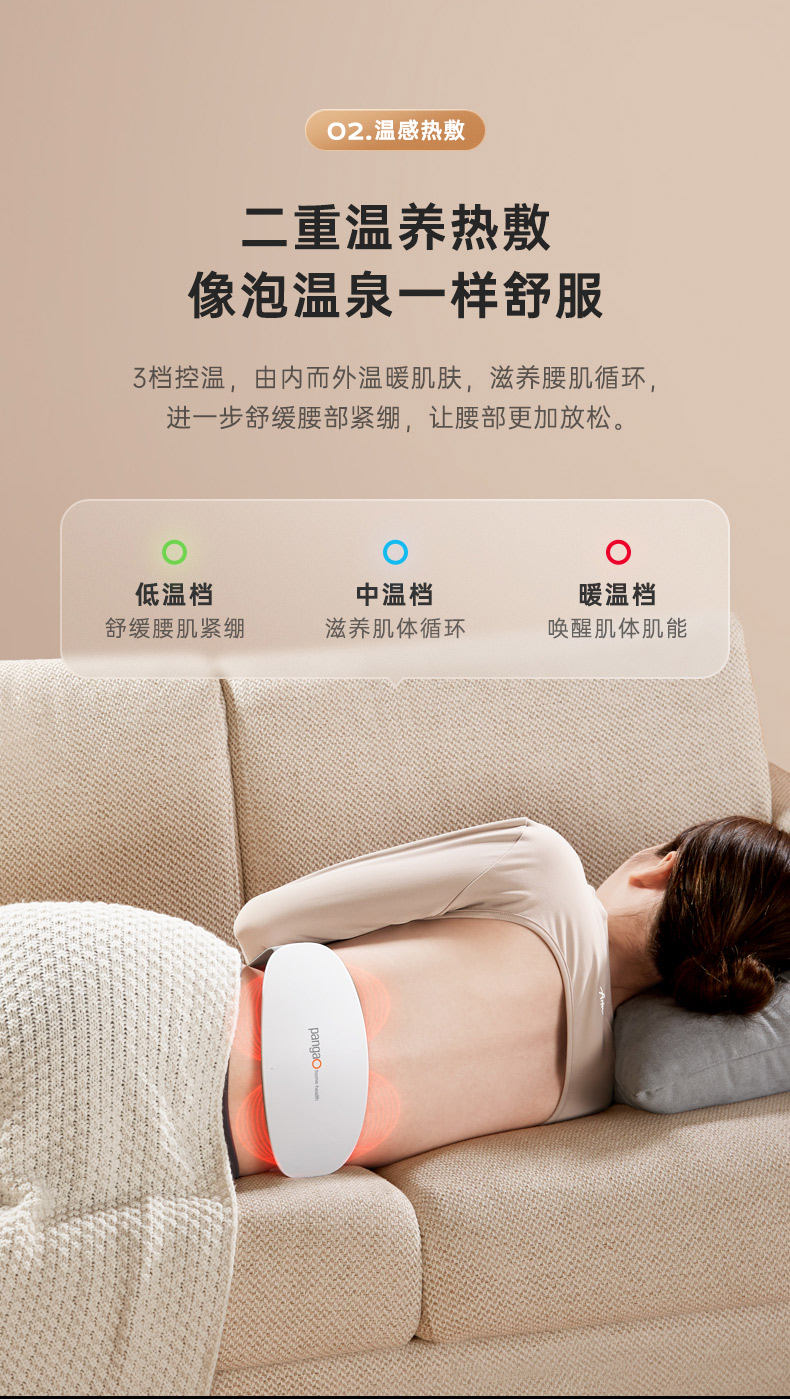 模拟真人按摩 16档可调,红光+脉冲+热敷同步作用效果加倍。人体工程学设计,精致美观,12mm纤薄机身仅有260g,贴合腰腹部曲线,可调节腰带魔术贴贴合,轻盈舒适,长时间佩戴也无压迫感。内置1500mAh锂电池,续航持久。