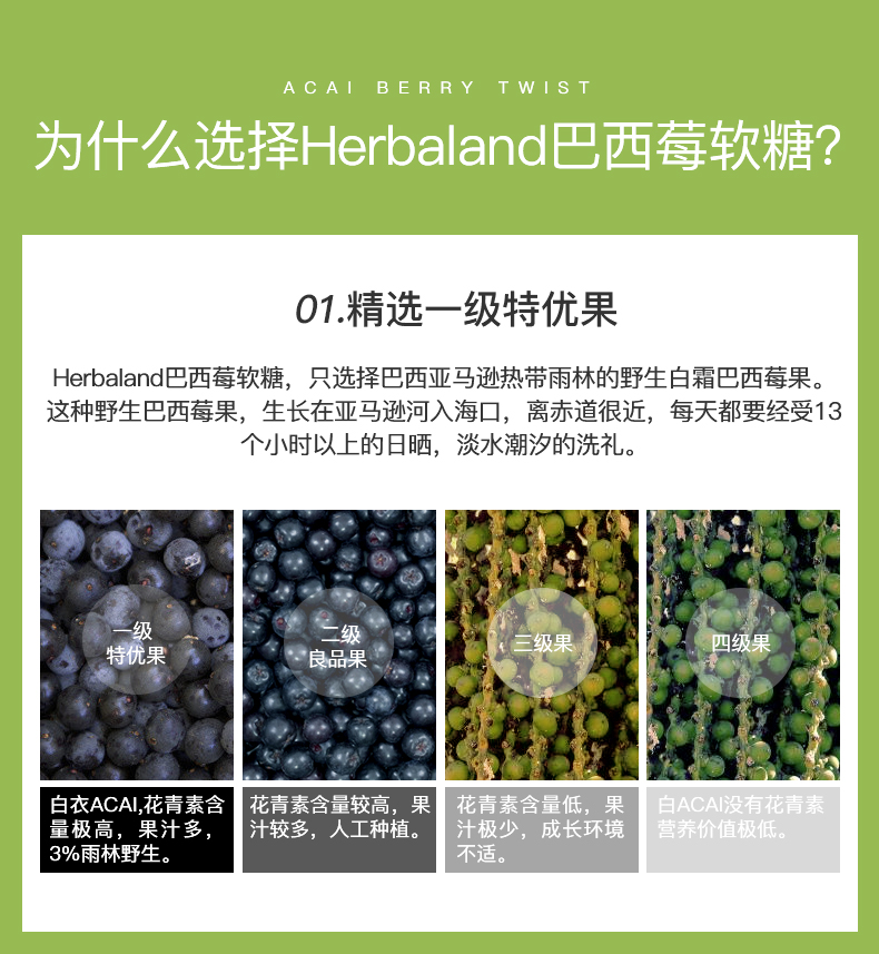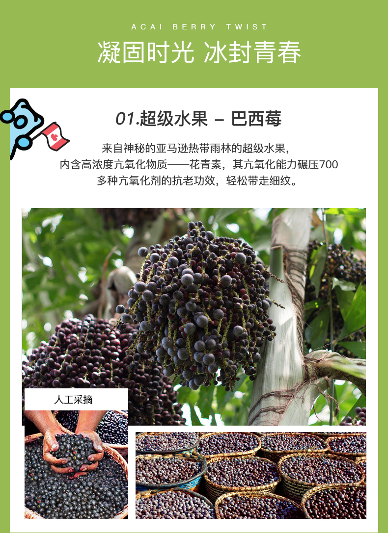 主原料只选择巴西亚马逊热带雨林的野生白霜巴西莓果,这种野生巴西莓果,生长在亚马逊河入海口,离赤道很近,每天都要经受13个小时以上的日晒,淡水潮汐的洗礼。