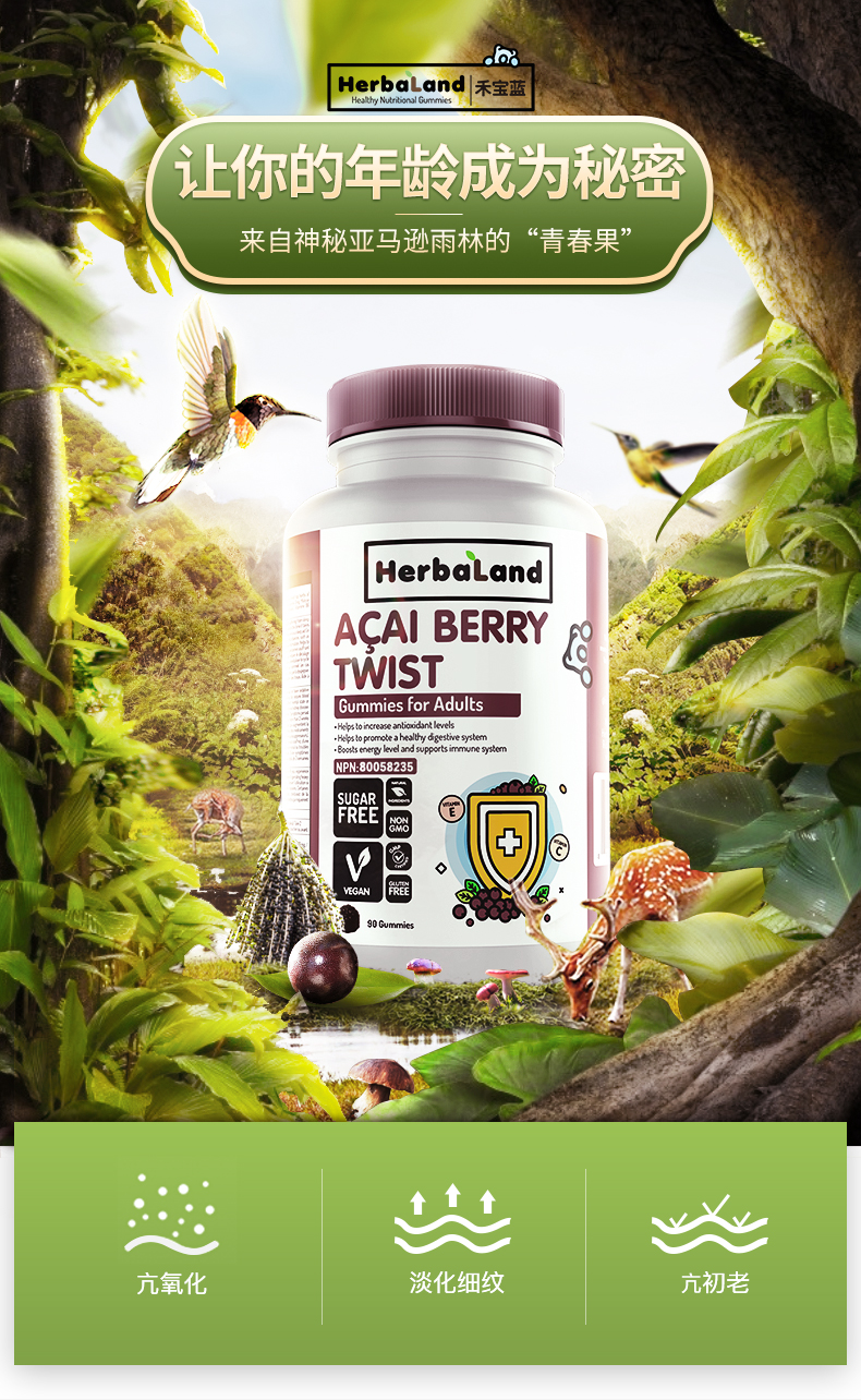这款Herbaland 抗糖抗初衰老 巴西莓维生花青素软糖,加拿大进口,主要功效是抗氧化、抗衰老、淡化细纹,每日3次、每次1粒。
