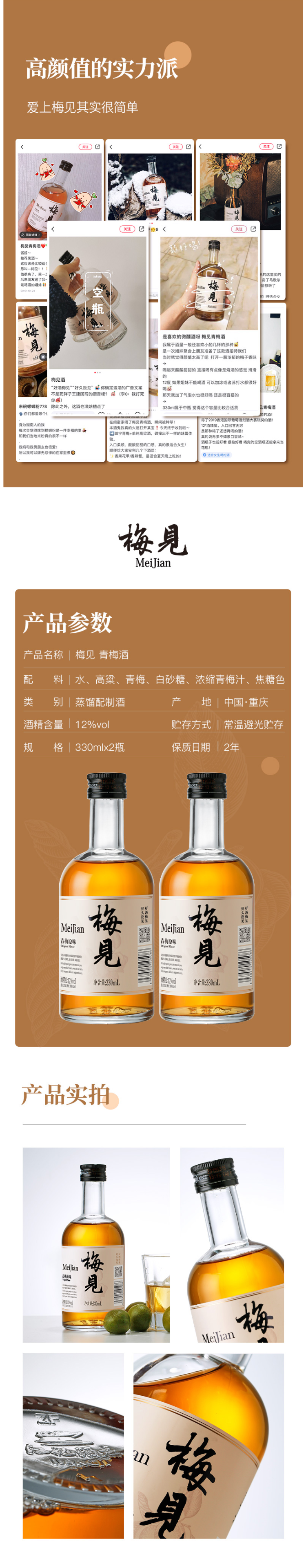 酿制方面:采用国家地理标志认证的普宁青梅,精选过大肉厚青梅,遵循传统工艺,采摘后72小时内糖渍工艺处理,历经90天缓慢出汁,保留纯粹青梅滋味。选用单一高粱酿造的高粱酒作为基酒跟其他白酒比起来口感更纯净,杂味更少,能更好的跟青梅融合,达到酸甜平衡没有杂味。