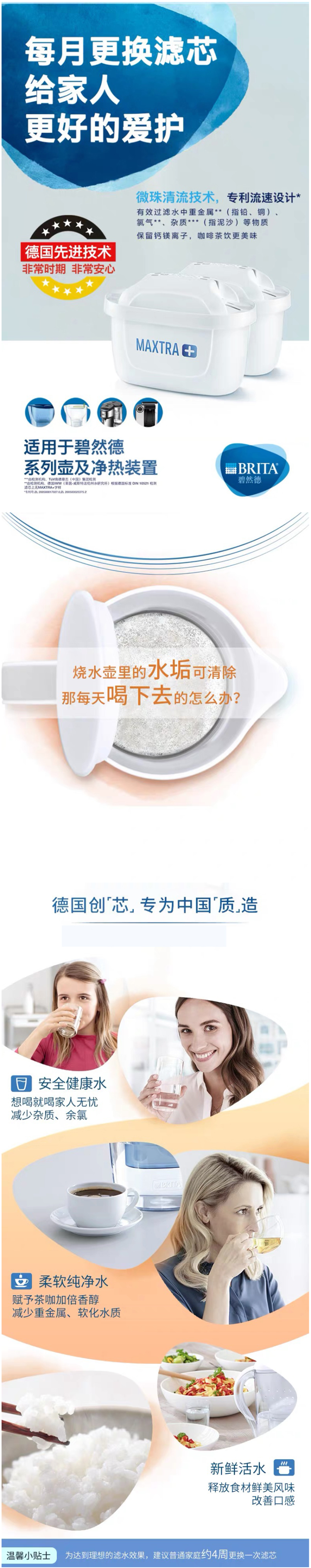碧然德BRITA 全新升级的三代滤芯“Maxtra+”,内部装填有更大面积的“活性炭颗粒”,可吸附更多污染物,提升过滤效果以及延长使用时间,提升30%滤水效果,适用于目前所有滤水壶,无论新旧。