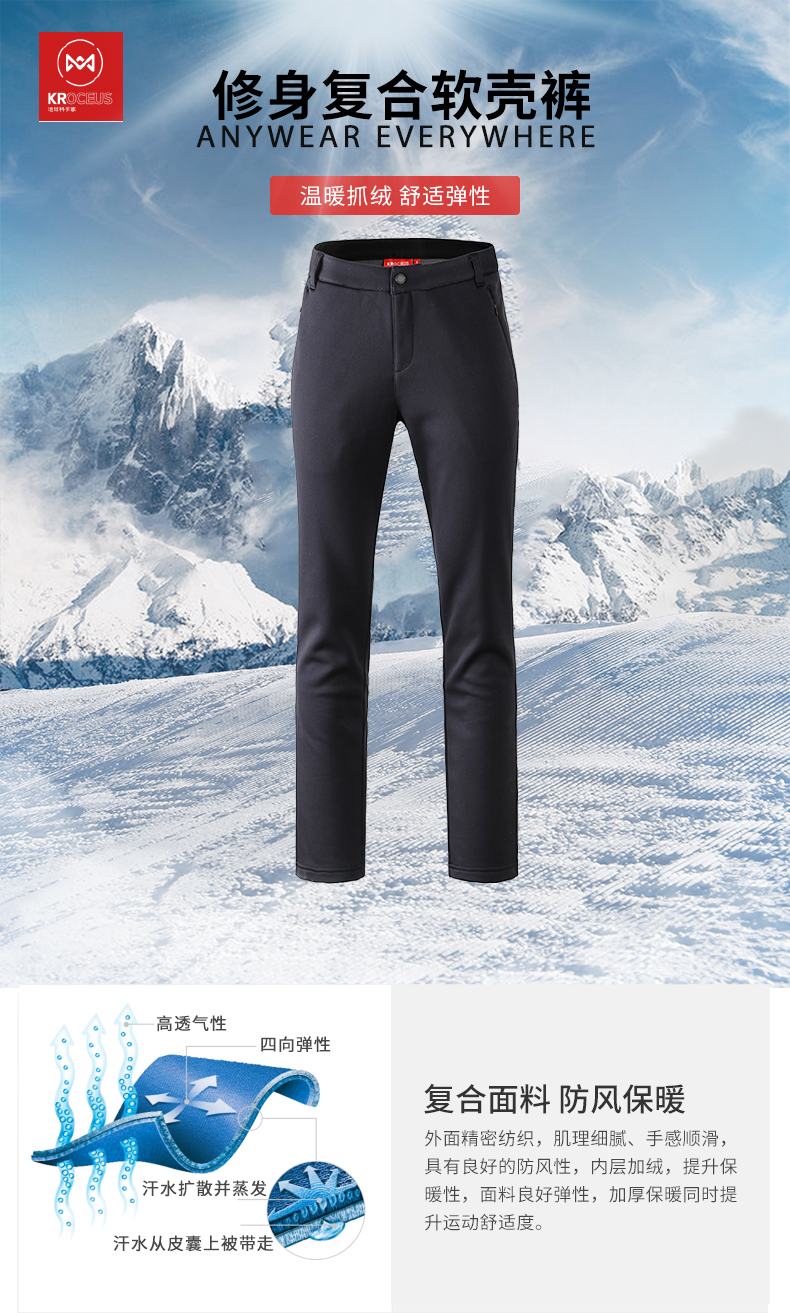 这款地球科学家软壳冲锋裤,采用复合软壳面料,摸起来的手感柔软不是很硬,外层是梭织的软壳面料,可达97%防风,还经过防泼水处理,里面是自家的Polartec抓绒,能很好的保暖;带弹力,上身不紧不勒不会影响活动性,且抗皱好打理。