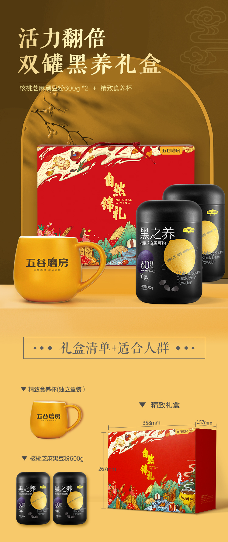 这款五谷磨房 高端 核桃黑芝麻黑豆粉,被誉为代餐届的“黑马”,入选了2018天猫双11全球食品巅峰榜,热销100万+,超98%好评。配方超强升级,核心成分来自云南的核桃仁>10%、鄱阳湖黑芝麻>23%、东北黑土地黑大豆>29%,特别添加了墨西哥奇亚籽、黑藜麦、黑米、山药等。