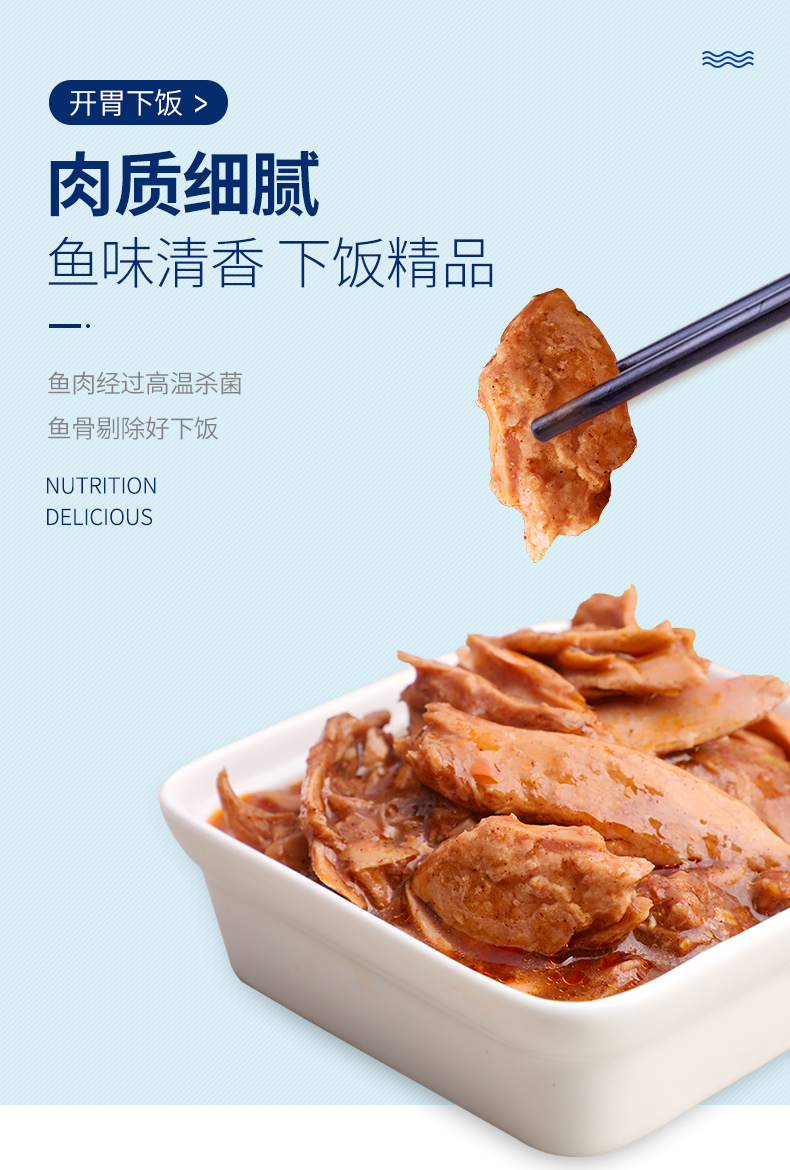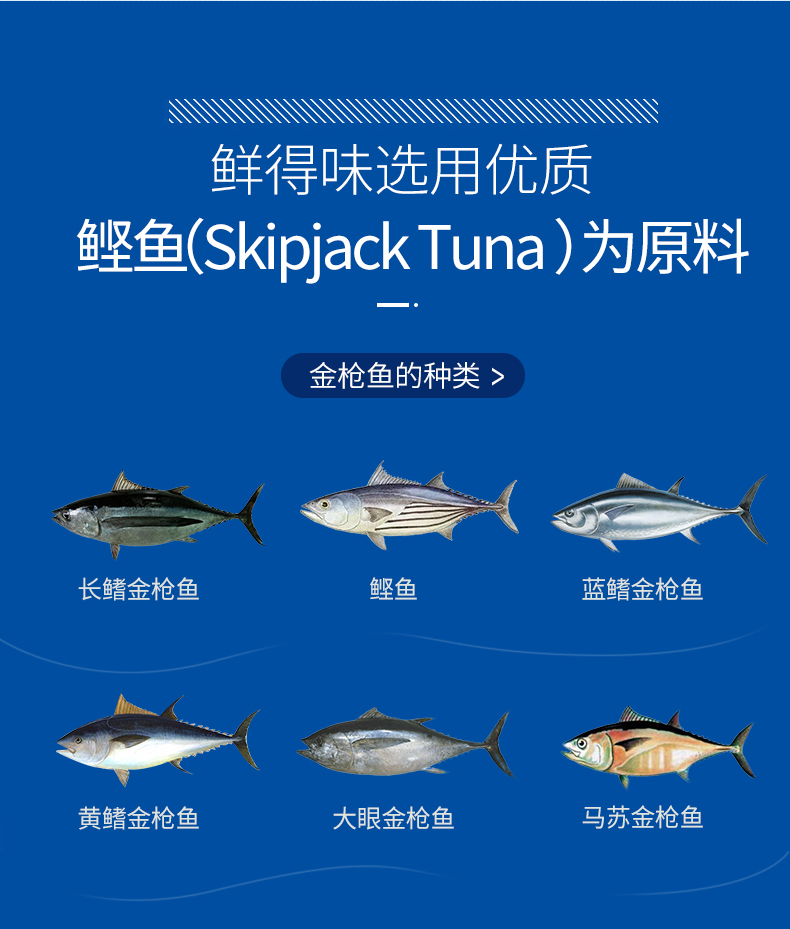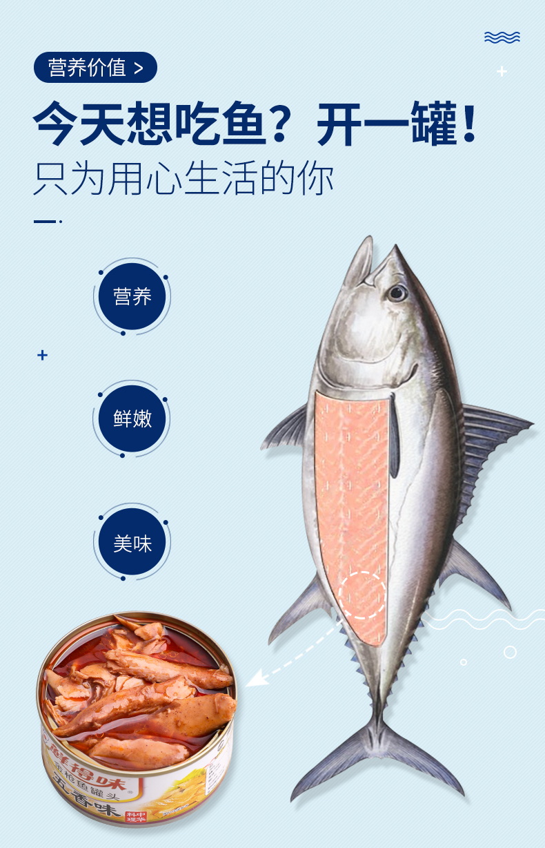 采用高温杀菌模式,保留了鱼肉本身的美味和营养,将鲜度锁于罐内,无需防腐剂,也能达到长久保鲜的目的。高温真空罐装,用矿泉水浸,可放心食用。