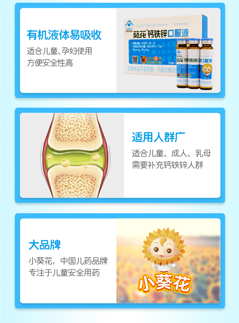 葵花品牌,线下药店都有卖,钙铁锌口服液儿童成长补钙,宝宝葡萄糖酸钙锌口溶液,一支补钙铁锌三样,每支含钙111.1mg、铁2.04mg、锌1.33mg液体钙易吸收。液体钙溶解度好,钙离子更易被吸收。适合儿童、孕妇、乳母等补充营养。旗舰店发货,品质靠谱。