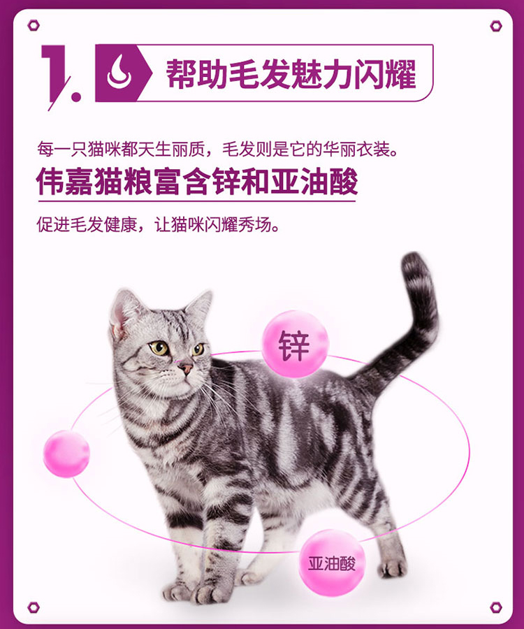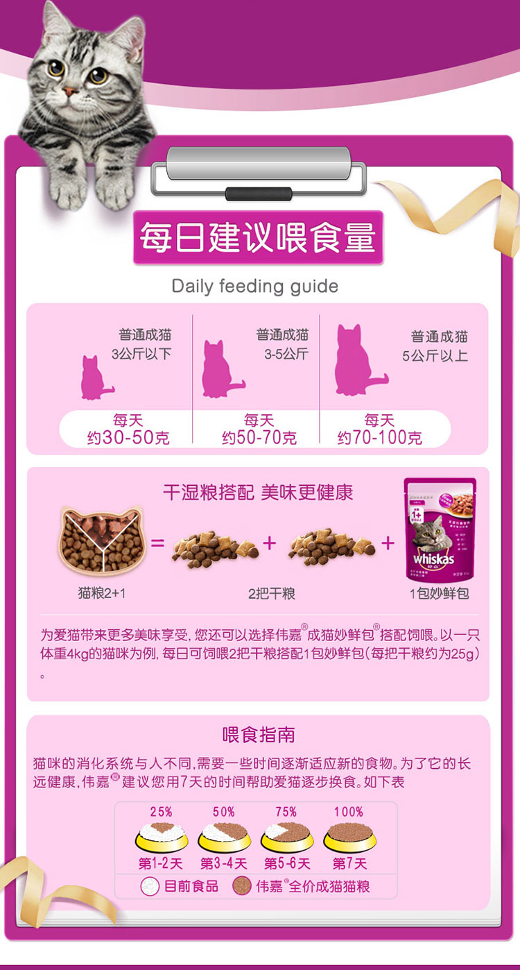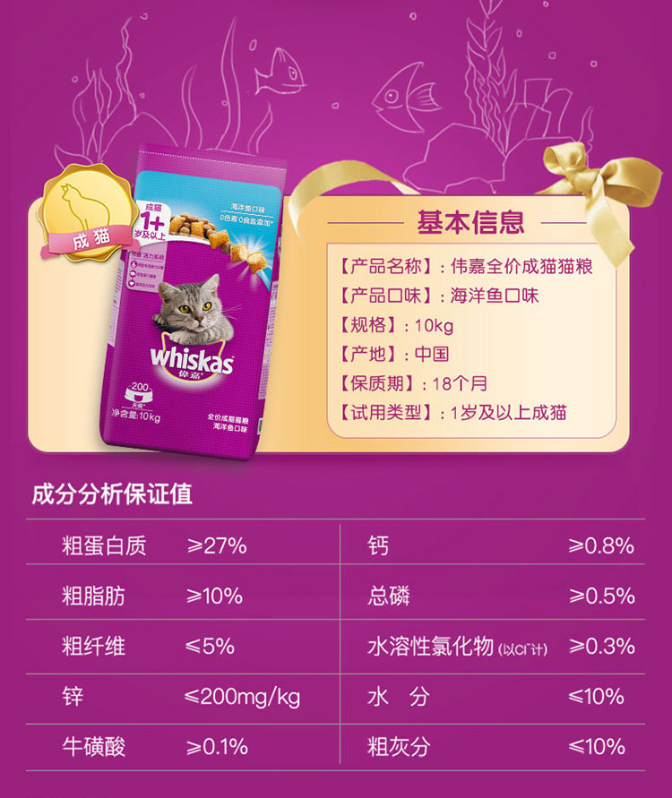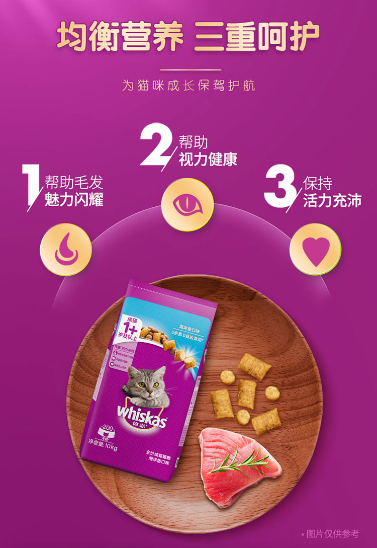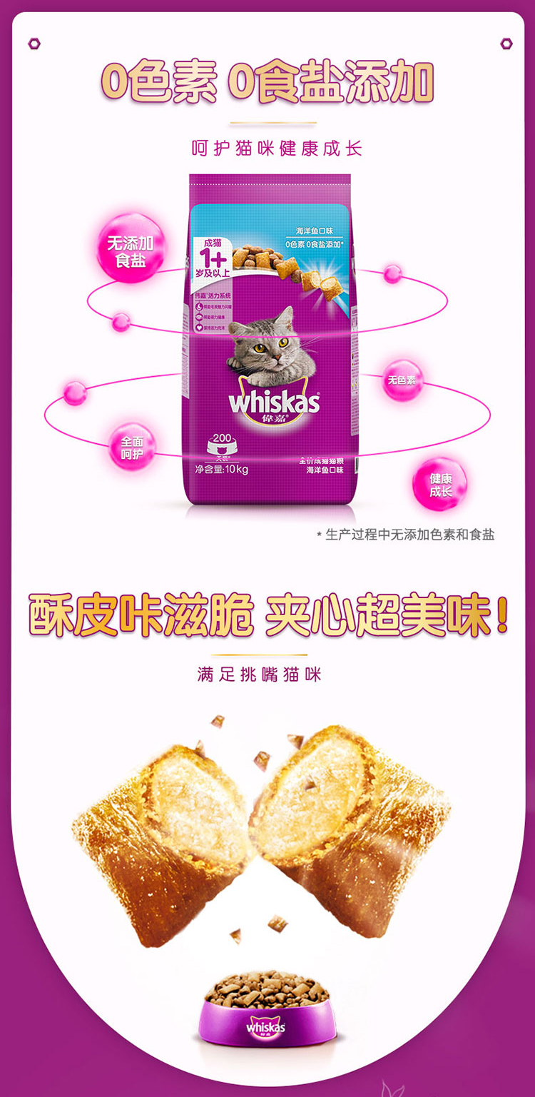 Whiskas 伟嘉是玛氏集团旗下的猫咪宠物食品品牌,这款猫粮全面均衡营养,0食盐0色素添加,猫咪吃着健康,富含锌和亚油酸,促进毛发健康闪耀,还特别添加牛磺酸和维生素A,有助于视力健康,眼睛明亮,酥皮卡滋脆,内含夹心,满足挑嘴猫咪。
