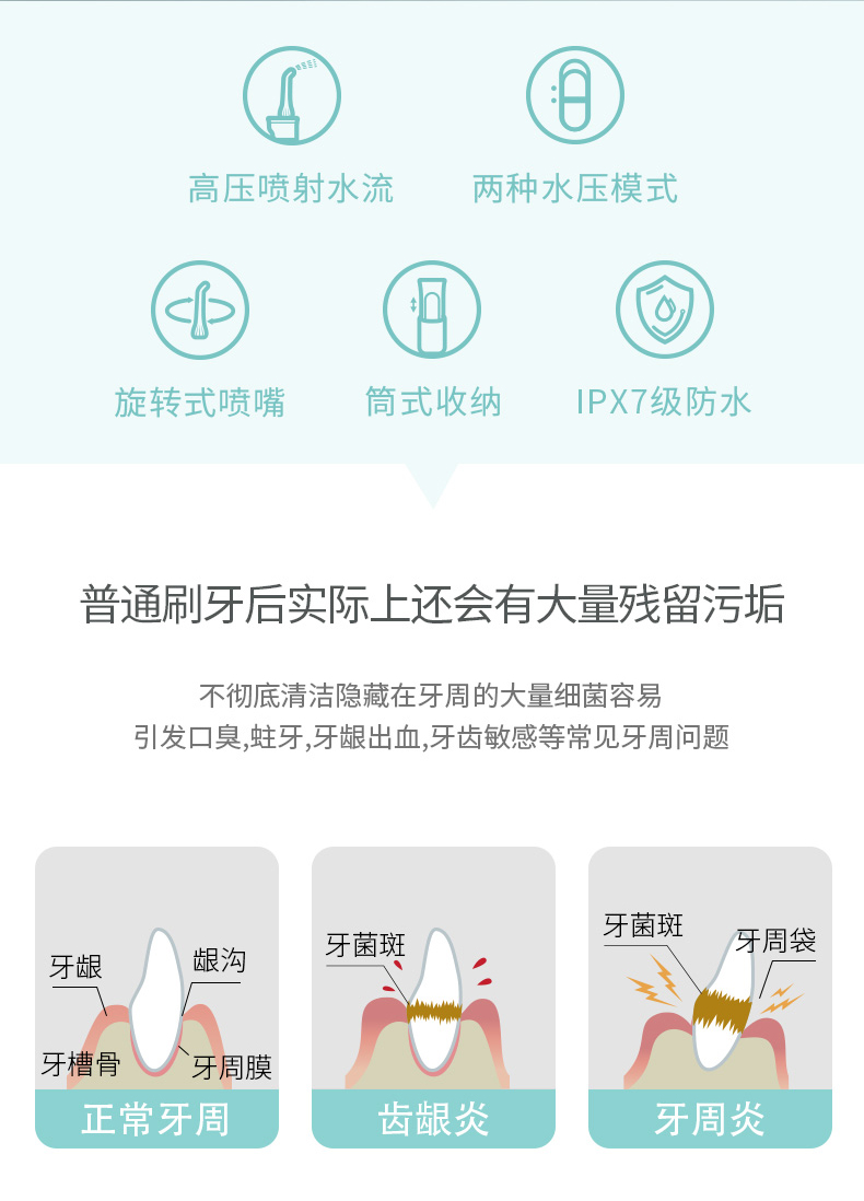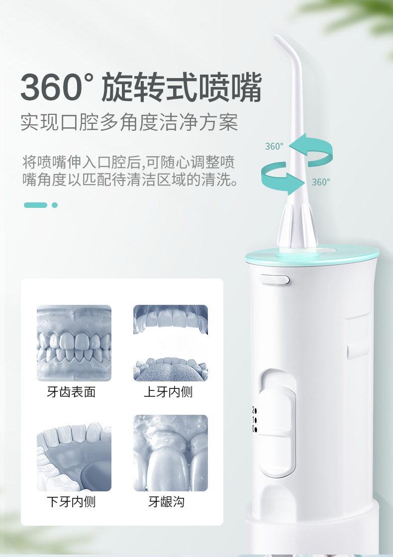 高压喷射水流搭配360度旋转喷嘴,能深入口腔盲区,即使牙齿排列不整齐,佩戴牙齿矫正器,牙齿牙龈之间缝隙等顽固部位,也可轻松清洗。
