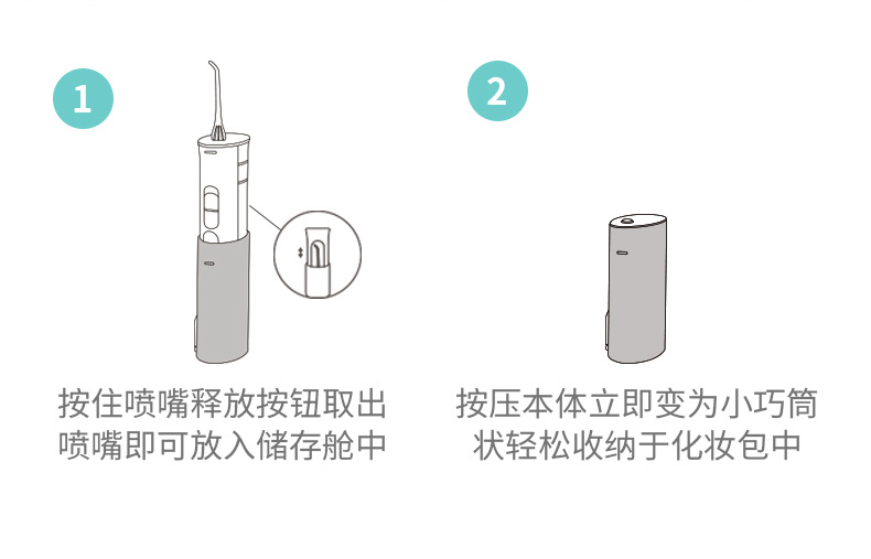 整机IPX7级防水,洗澡时也可使用。桶式收纳设计,收纳后体积小巧,可轻松放入化妆包内,非常适合出差、旅行时携带。