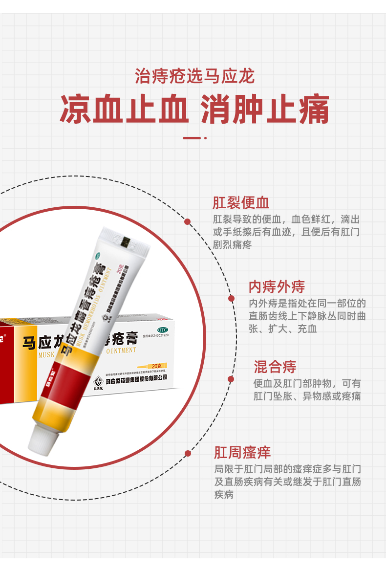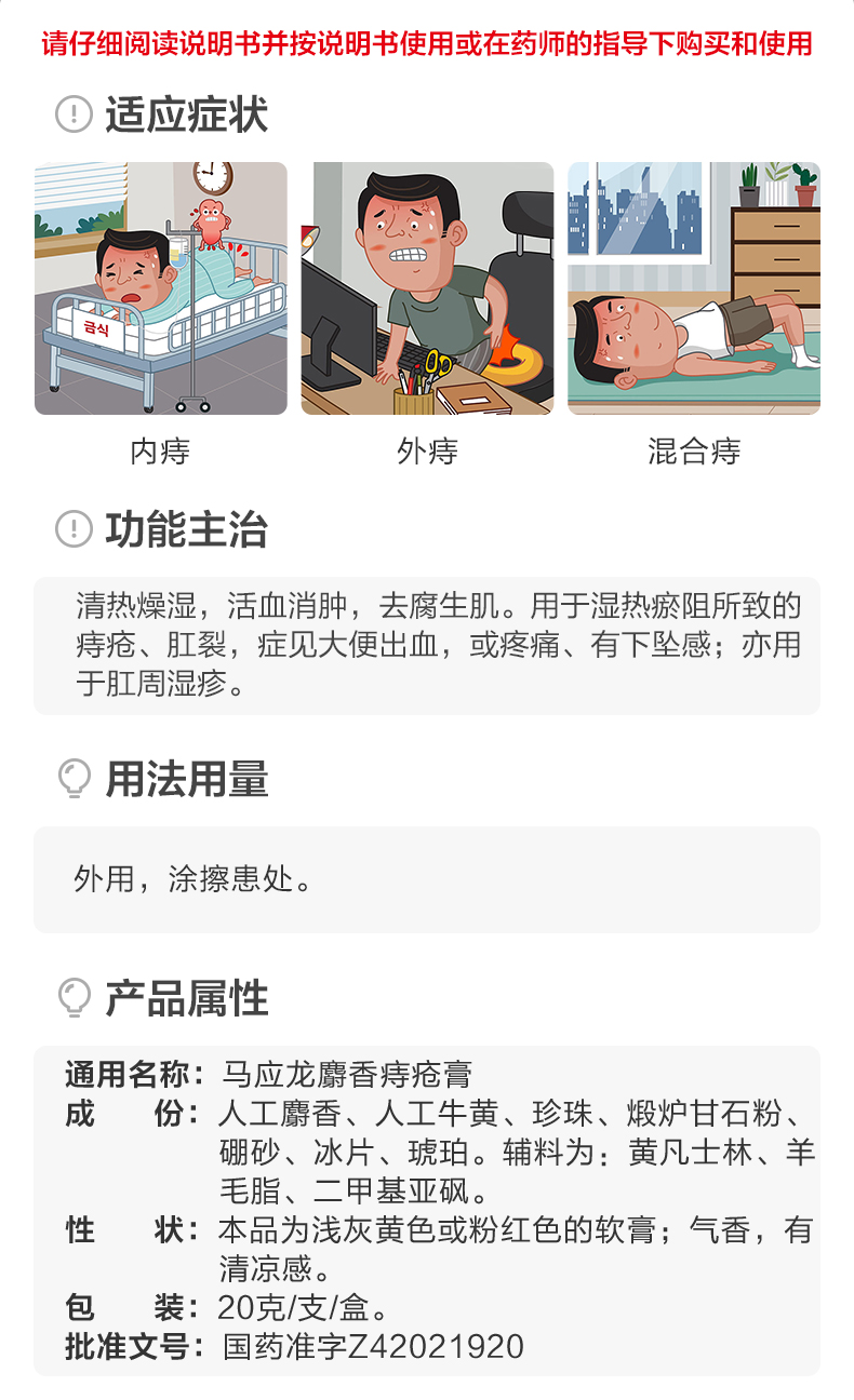 这款马应龙 麝香痔疮膏,主要成分是人工麝香、人工牛黄、珍珠、冰片、炉甘石粉、硼砂、琥珀,具有清热解毒、消肿止痛、止痒止血、润肠通便的功效,适用于肛裂便血、内痔外痔、混合痔、肛周瘙痒的情况。