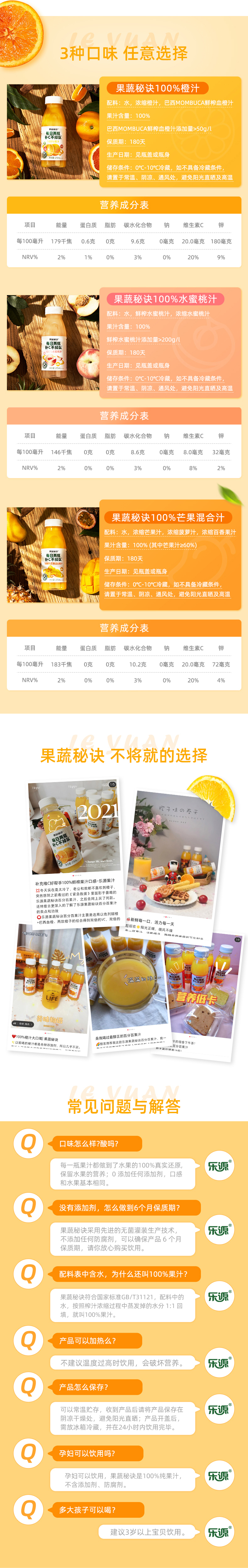 这款乐源100%纯水果汁,选用以色列进口橙、搭配巴西MOMBUCA血橙为原料榨汁,0色素、0糖、0脂肪、0防腐剂添加,最后UHT超高温瞬时杀菌,最大程度保留了水果的风味与营养,最后无菌冷罐装。