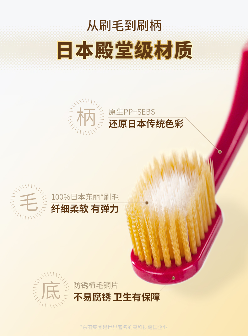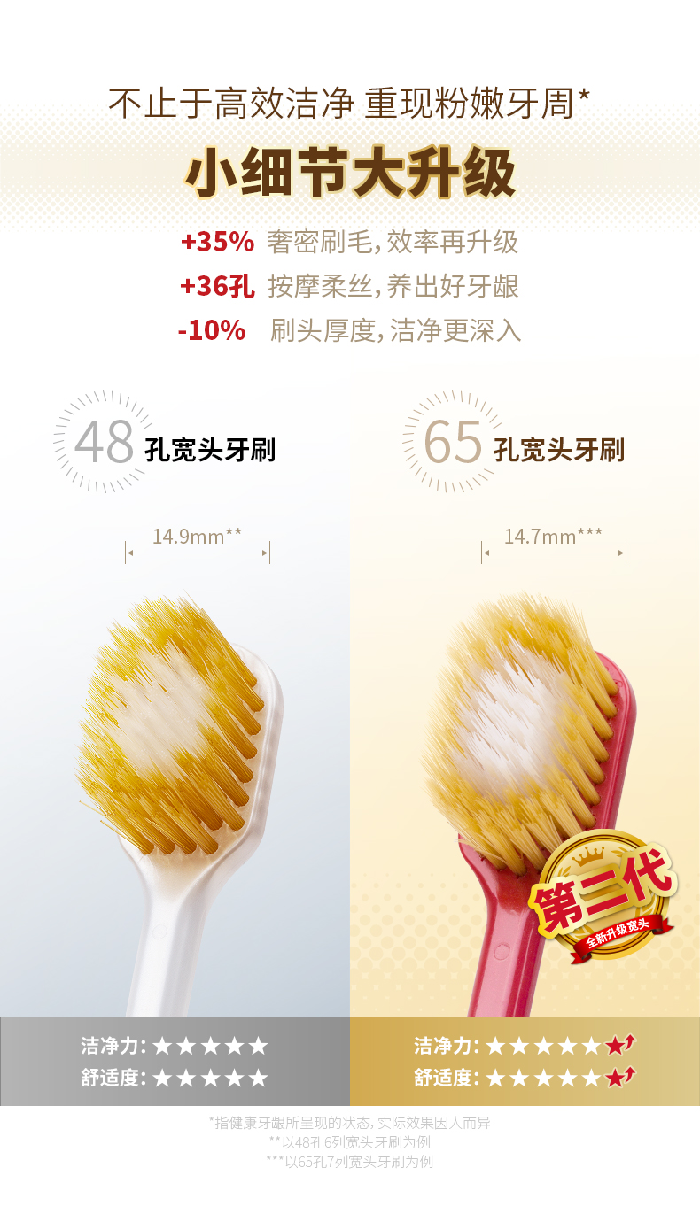 这款牙刷是第2代升级款,革新加宽设计,宽幅65孔8列组合牙刷,清洁面25%UP,由三层不同柔软度的高密刷毛组成,全方位满足洁齿护齿需求,超纤细仅有0.02mm,能深入清洁牙龈沟,有效避免牙龈出血、红肿、敏感等问题,同时具有亮白、洁龈、按摩的作用。