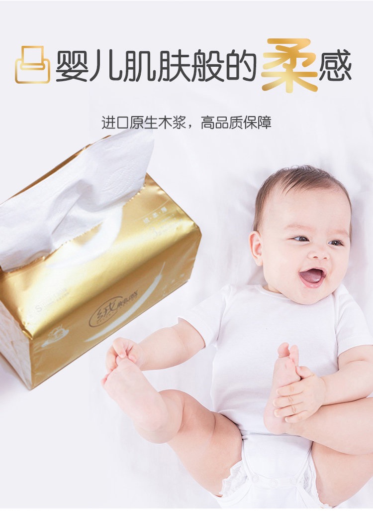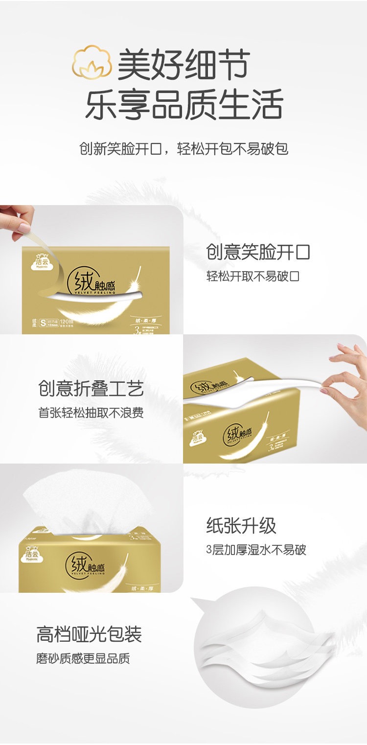 这款洁云 绒触感抽纸,采用巴西进口的桉树原生木浆制成,采用GBPM精柔成纸工艺,不添加荧光剂、增白剂,细腻柔软,舒适亲肤不刺激。