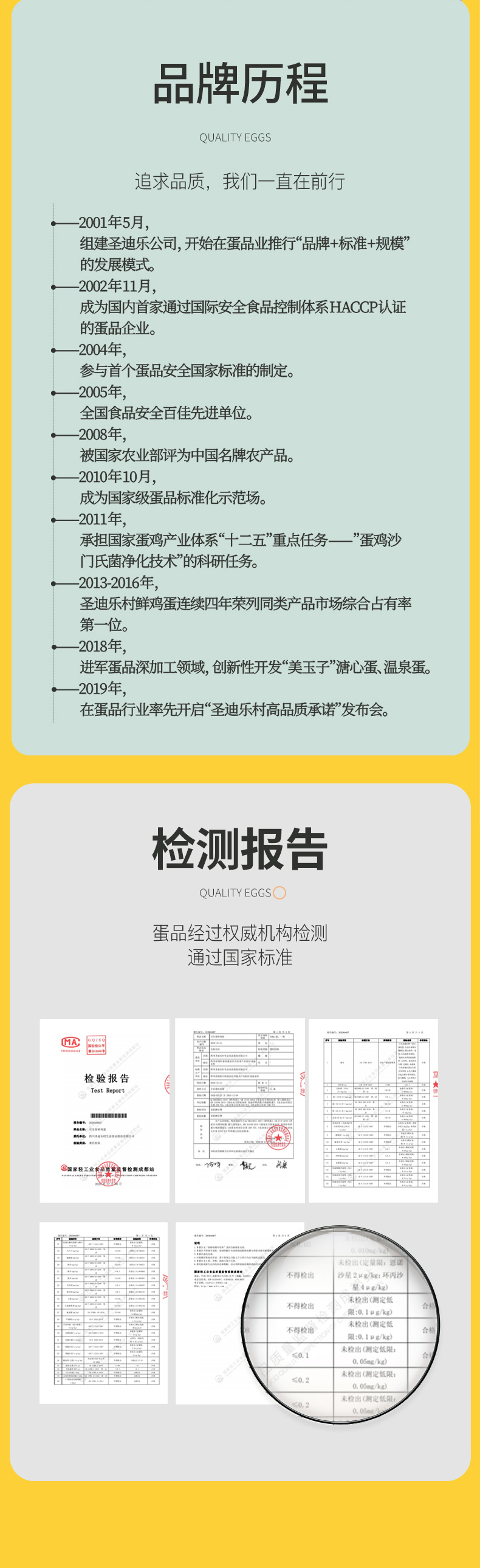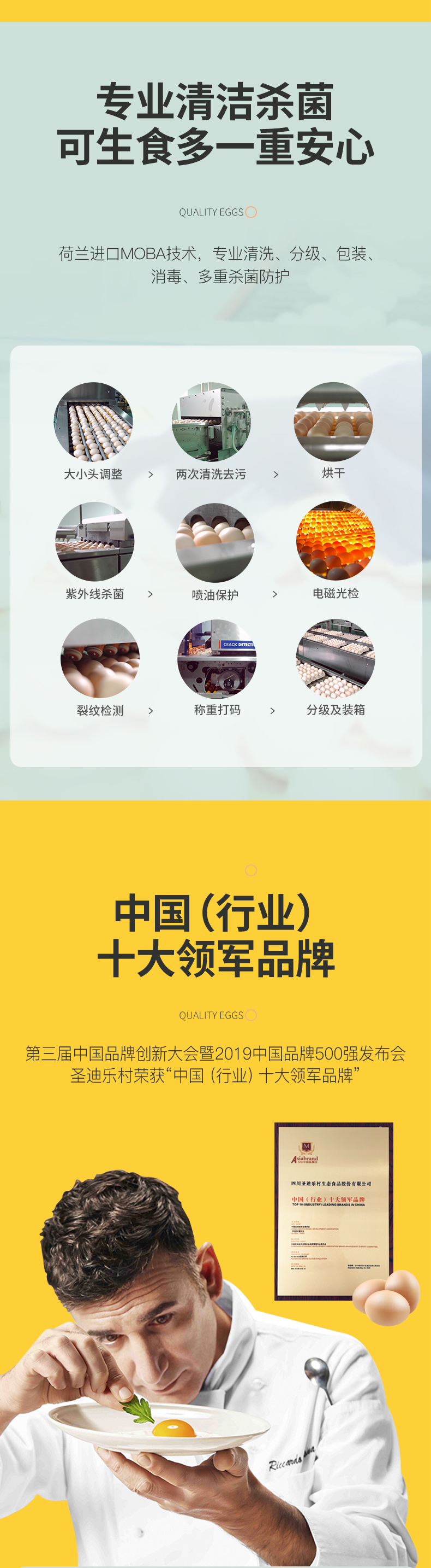圣迪乐村是国宴峰会指定的蛋品供应商,采用德国罗曼种鸡,自主研发益生菌专属粮食配方,拒绝使用抗生素激素,同时引进荷兰进口MOBA技术,专业清洗、分级、包装、消毒、多重杀菌防护,是放心安全的鲜鸡蛋,达到A级标准。