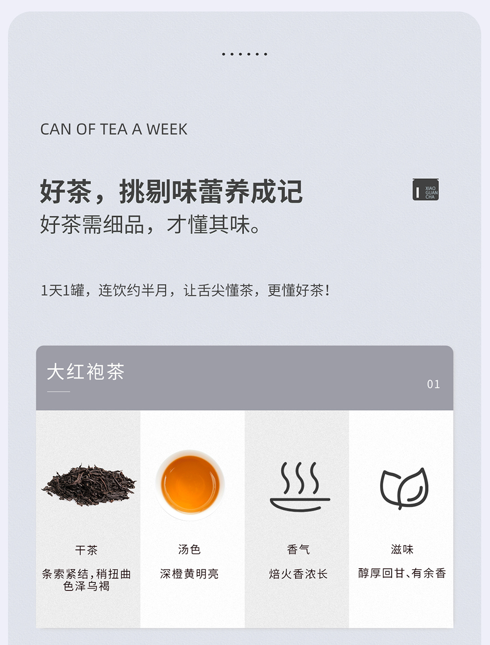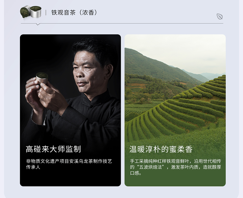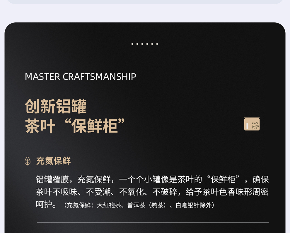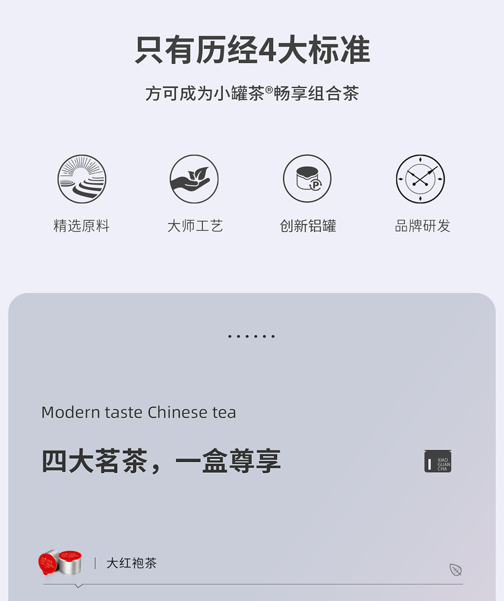 小罐茶的茶叶均来自于产地严选,由国家级非物质文化遗产的技艺传承人监制,铝罐覆膜,充氮保鲜,使茶叶随意保存就能不吸味、不受潮、不氧化、不破碎,研发团队用现代科学的方法,让好品质从经验到科学,标准化生产。