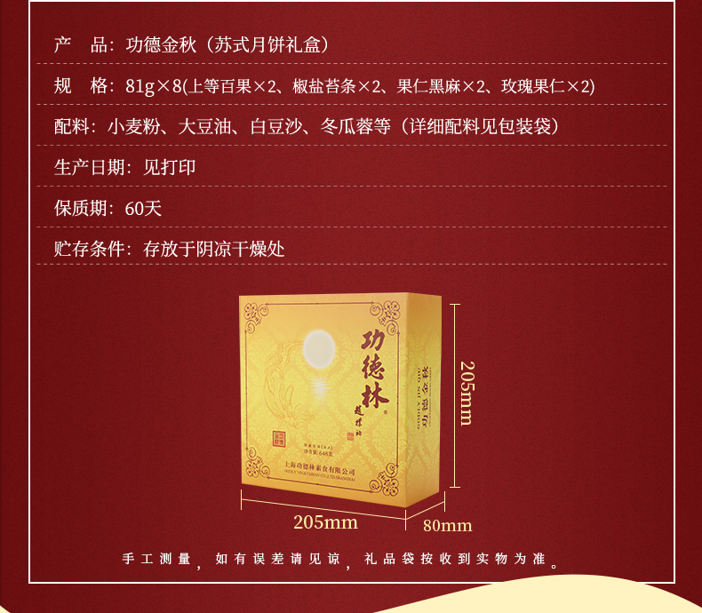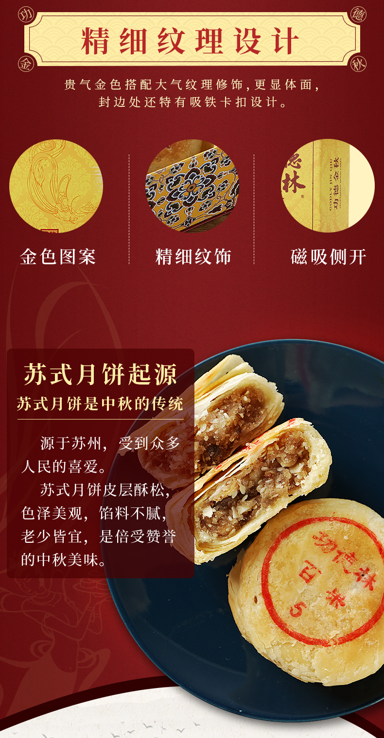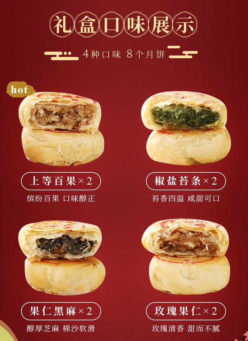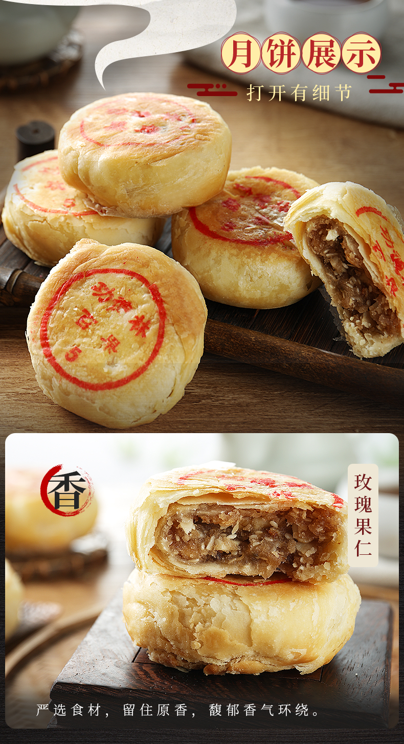 功德林创始于1922年,是一家将近百年历史的著名老字号品牌企业,享有素食鼻祖之称。这款功德林月饼主打“净素”,全部为植物素食,适合过节送老人,珍选核桃仁、瓜子仁、松仁等食材,坚持苏式古法制作工艺,皮层酥松,色泽美观,馅料不腻,老少皆宜。