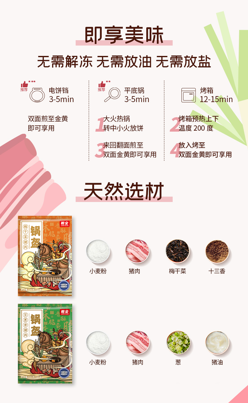 梅干菜猪肉、京葱香两口味可选。无需解冻、无需放油,食用快捷方便。外面摆摊至少十来块一个,自家在家就能制作出的锅盔饼,喜欢这口的童鞋不要错过啦!