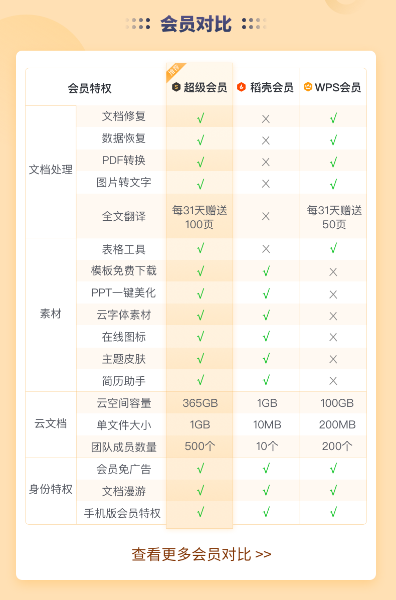 3)超级会员:是「WPS会员」与「稻壳会员」的综合型会员,是目前WPS中拥有最全特权会员。