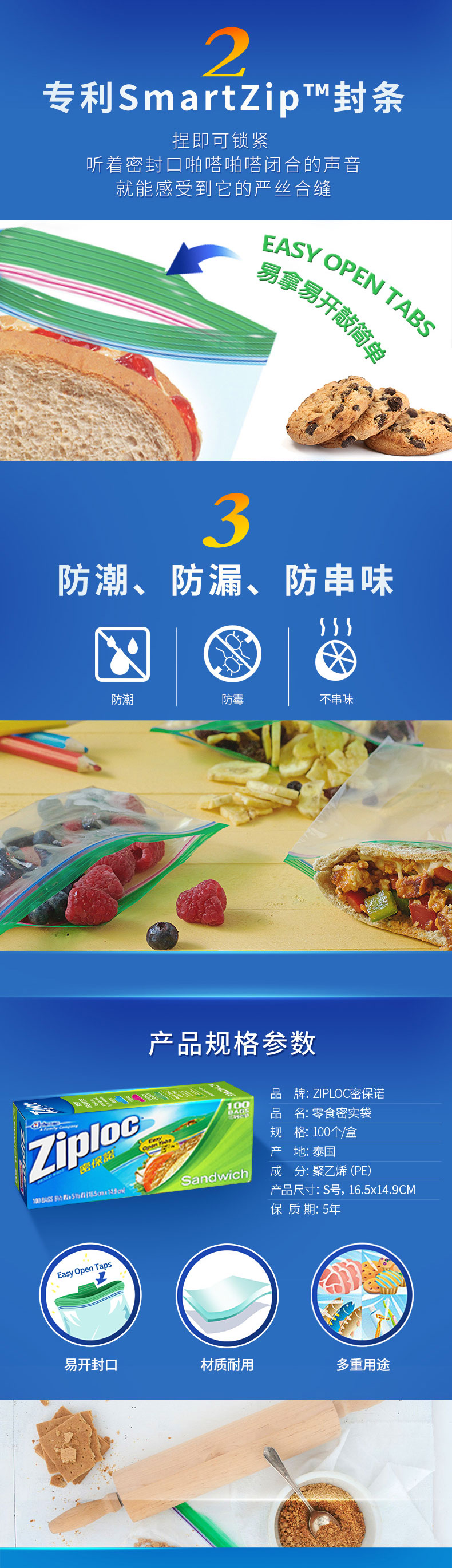 这款Ziploc 密保诺 食品密封袋,很多美食节目中都有出现,采用聚乙烯PE材质,能够与食物直接接触,不含BPA、塑化剂,同时通过美国FDA相关标准,使用安全放心。双层密封设计,更加保险不串味,加宽易开口,方便开合。产品尺寸: S号,16.5*14.9CM