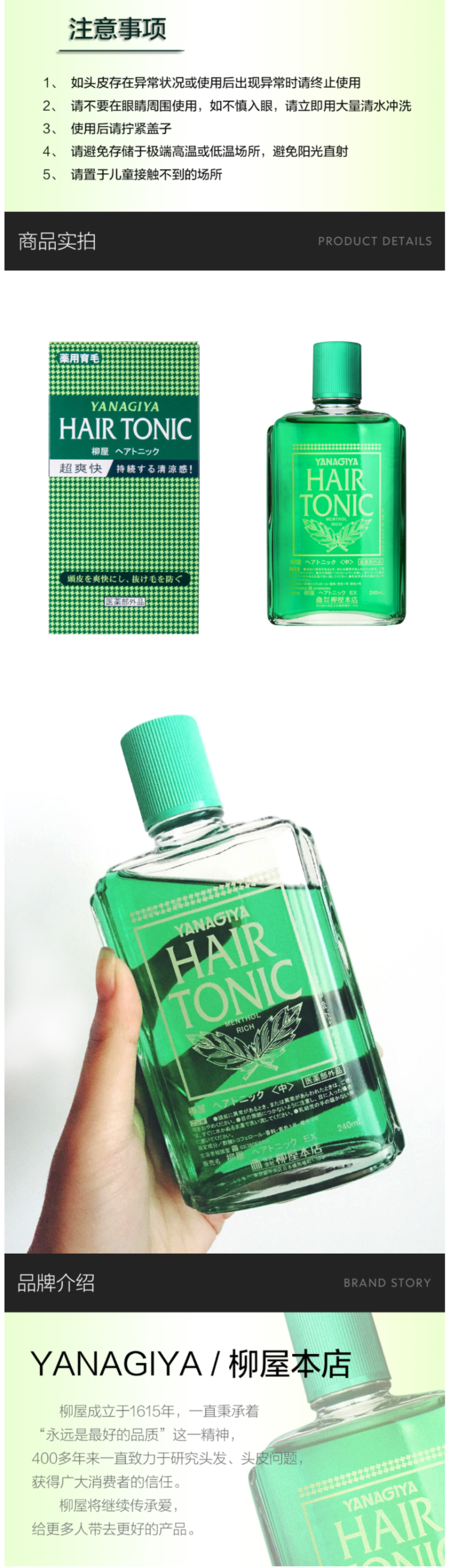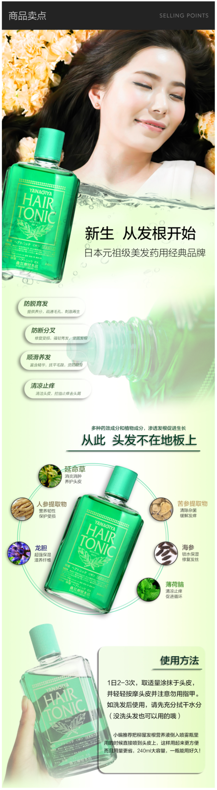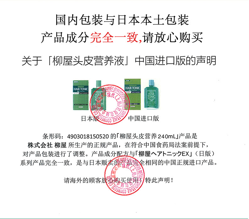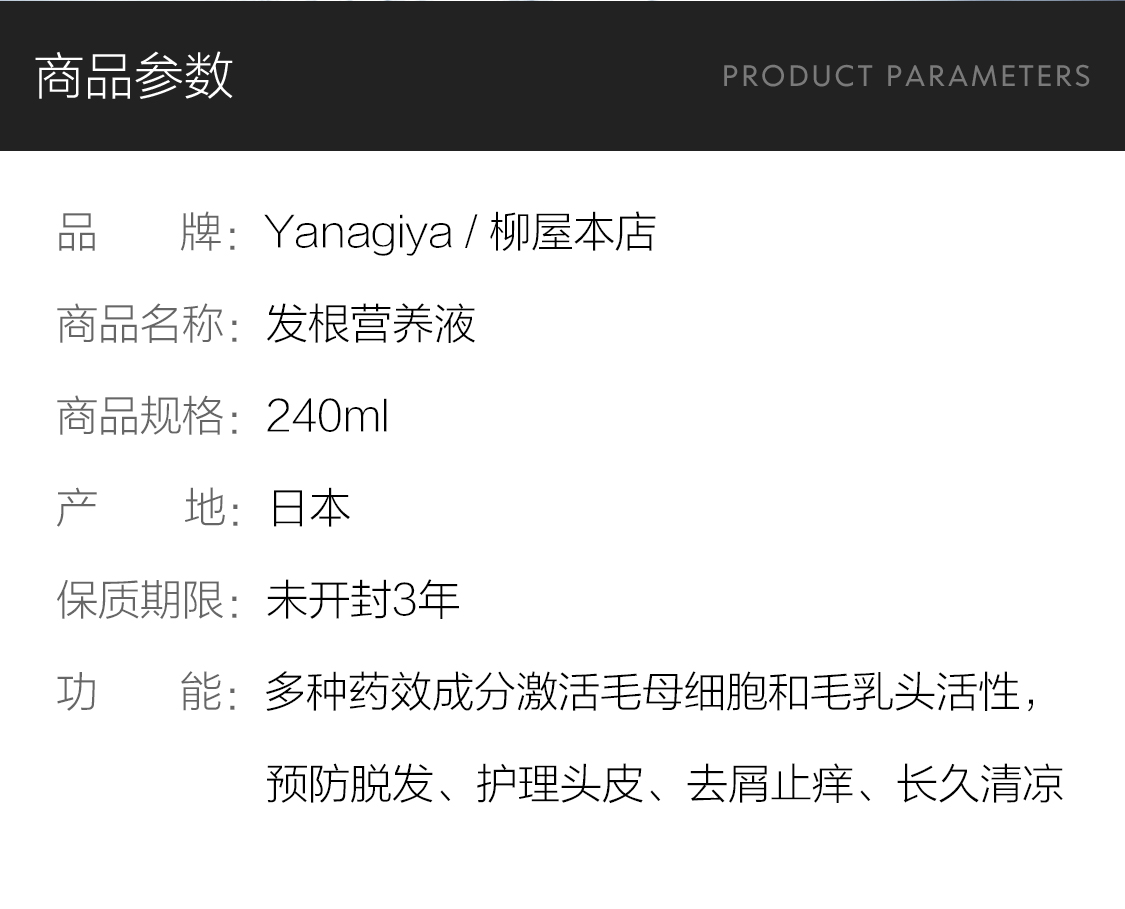 这款柳屋 YANAGIYA 头皮发根营养液,日本进口,采用草本精华配方,日本獐牙菜提取物、苦参提取物、香茶菜叶/柄提取物,具有深度滋润头皮、呵护发根、有效防脱育发、改善常见脱发的功效。配方中不添加香料,无额外的味道,使用时会有沁人心脾的清凉感,规格是240ml*2瓶。