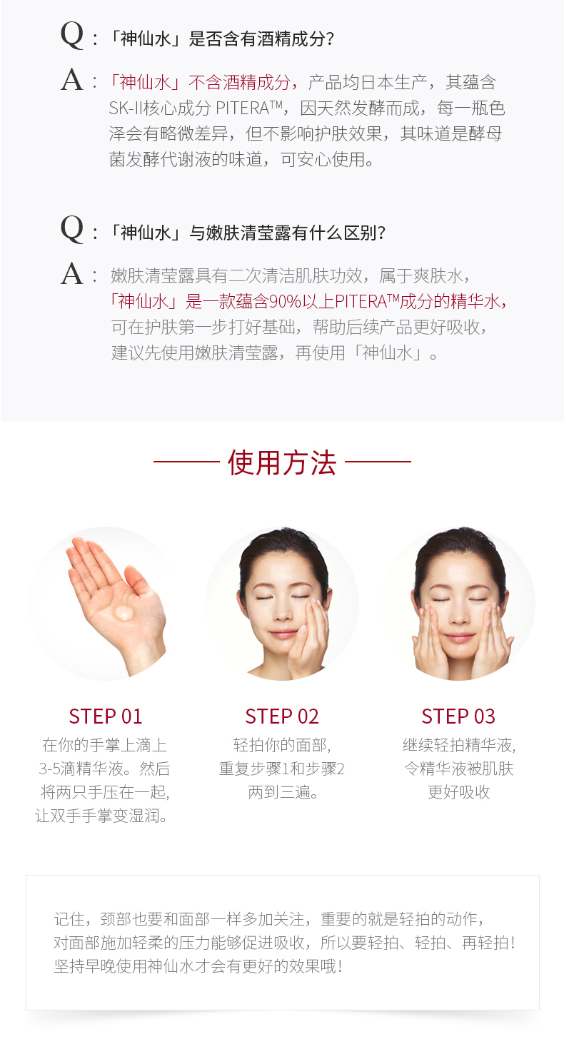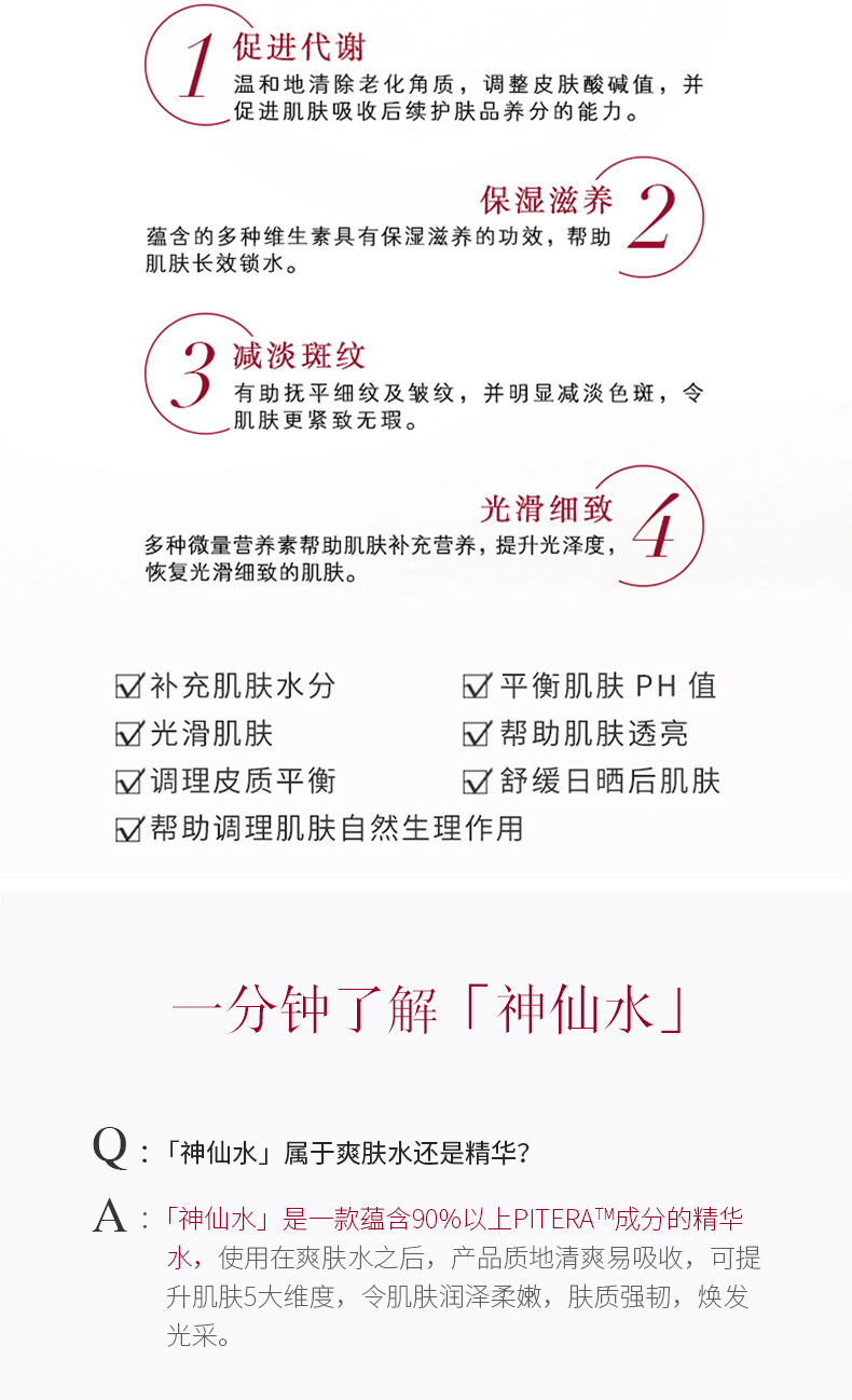 SK-II神仙水含有高达90%以上的富含多种营养成分的PiteraTM酵母精华。每天为肌肤提供充足营养并调理肌肤,深层保湿,平衡肌肤的pH值,塑造润泽光洁的肌肤本色。 PiteraTM提升五大美肌维度,让肌肤升华至晶莹剔透: