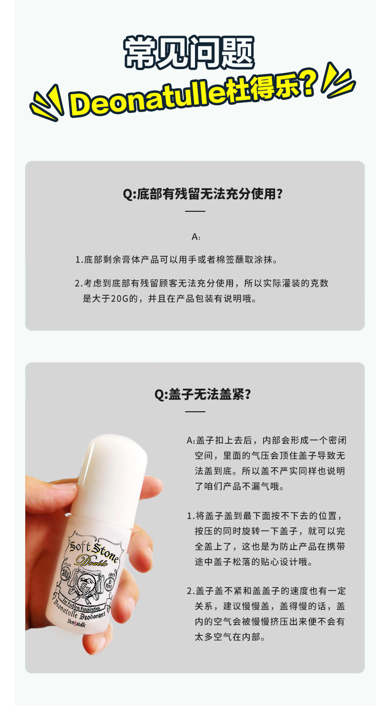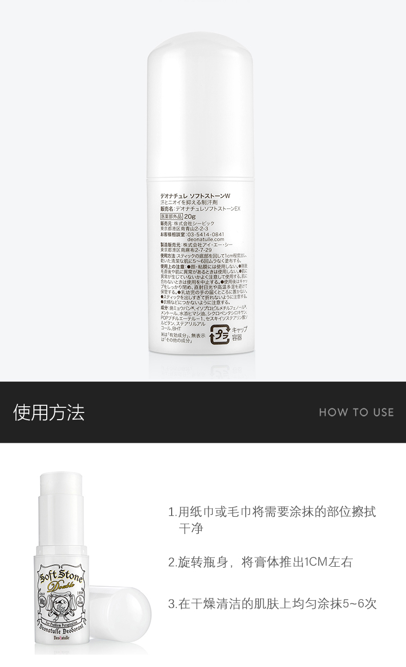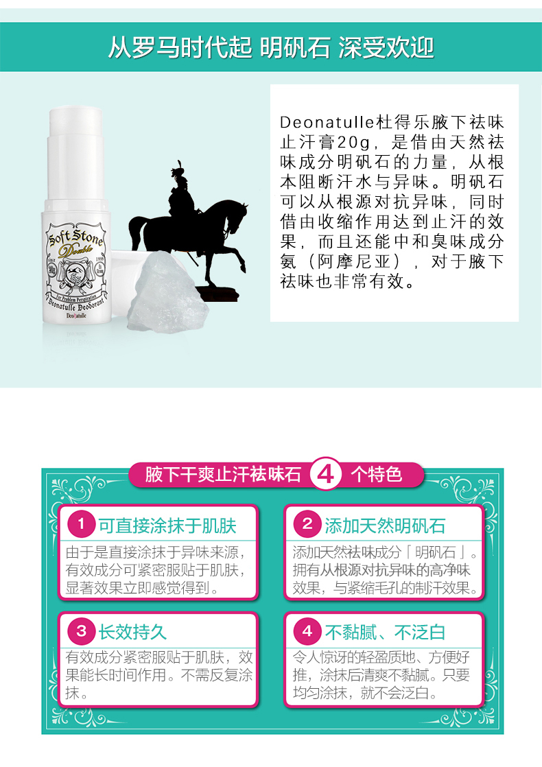 这款腋下消臭膏,采用的是天然矿物盐明矾石,无色无味,是比较天然的除臭剂,在表面形成杀菌膜,可隔绝汗臭味,还添加有薄荷醇,清爽舒适。纯天然石粉加工,去除皮肤汗味、止汗杀菌,还可以消除狐臭、脚臭的味道。产品小巧便于携带,男女都可以用。