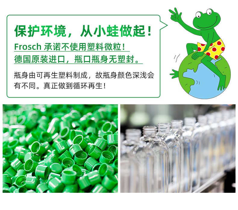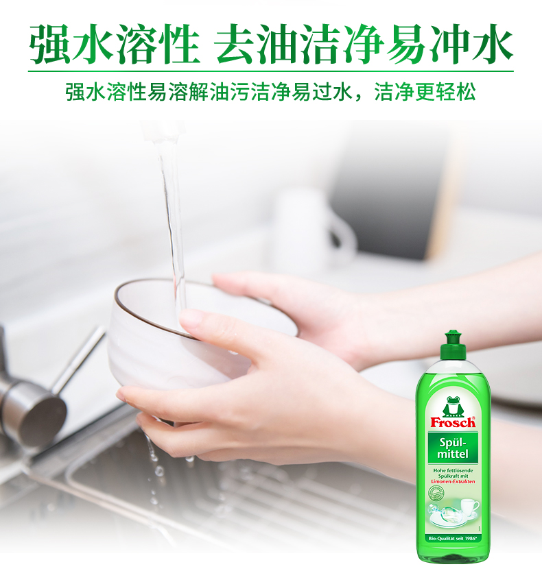 这款Frosch 柠檬浓缩洗洁精,萃取天然柠檬果皮精华,可迅速瓦解油污去异味、低泡浓缩强水溶性,轻松过水,碗具更洁净,产品高浓缩技术,不添加增稠剂,3-5ml可兑5L水,高效清洁的同时,保养洗济对象;瓶身可自然降解,环境零负担;使用之后,手感温润,拒绝干燥、紧绷甚至过敏反应。