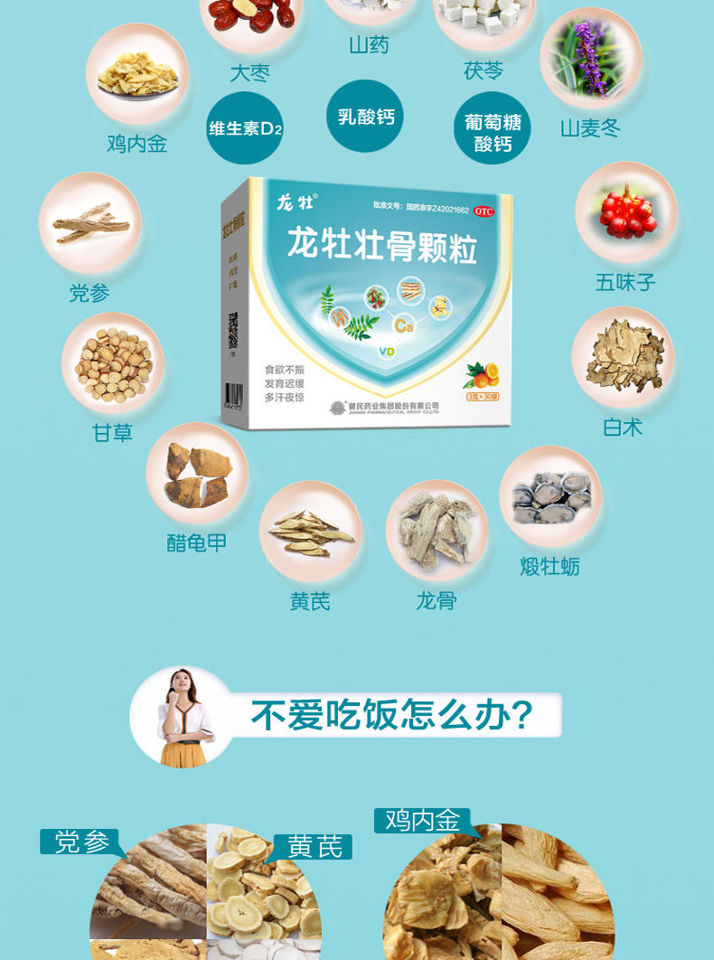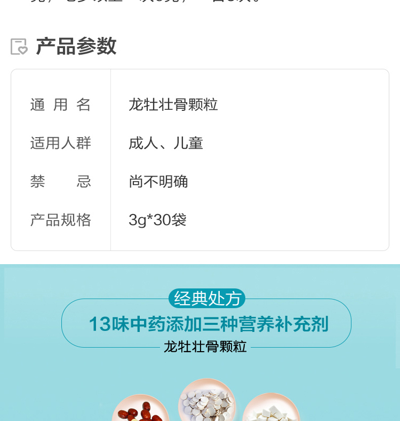 规格为3g*30袋*4盒。这款龙牡壮骨颗粒采用山药、鸡内金、山麦冬、党参等多味中药,添加有机钙维生素D,提高免疫力,健脾和胃,强筋壮骨,补钙同时促进钙吸收。