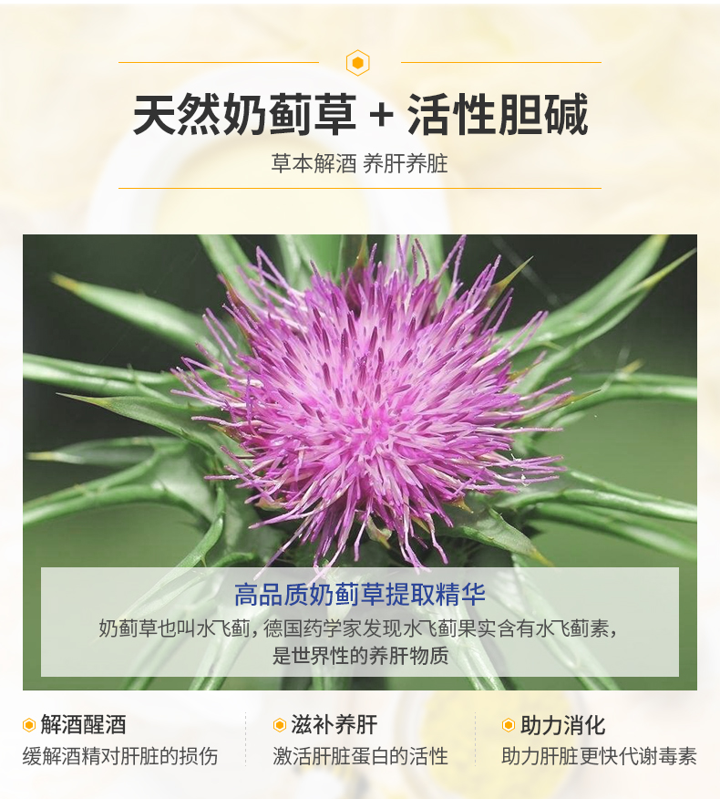 奶蓟草是传统的治肝良药,在欧洲已有千年的应用史,同时,护肝片还富含黄酮和胆碱,能激活肝脏蛋白的再生,利用抗氧化作用保护肝细胞,修复被酒精等负面因子所带来的损伤,有助于促进肝脏中的脂肪代谢,更顺畅排出体内积压毒素,维系肝脏的正常运作,起到预防肝炎、脂肪肝等肝脏疾病的作用。