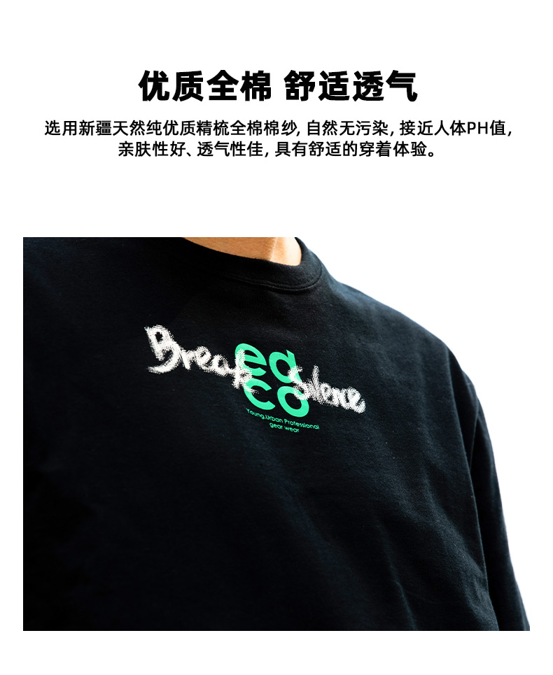 衣身上是流畅洒脱的手写文体,自然随性的衬托在城市街景之上,亮眼的色彩搭配和晕影的迷幻设计效果,强烈凸显着街头潮流风格。印花是采用数码印+胶浆印多次印制而成,防脱色防断裂,美观潮范。