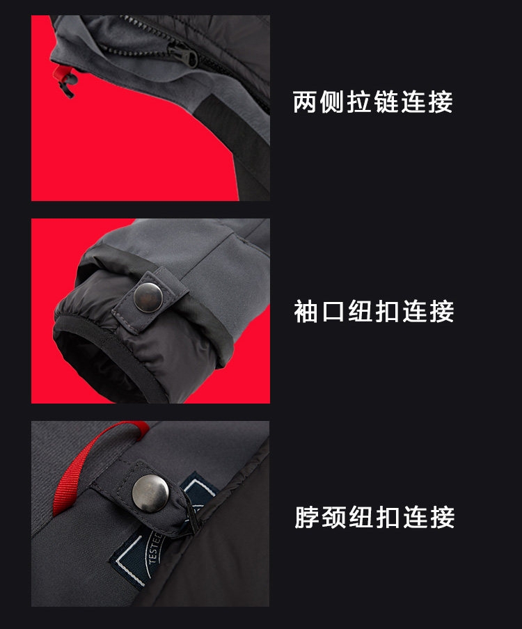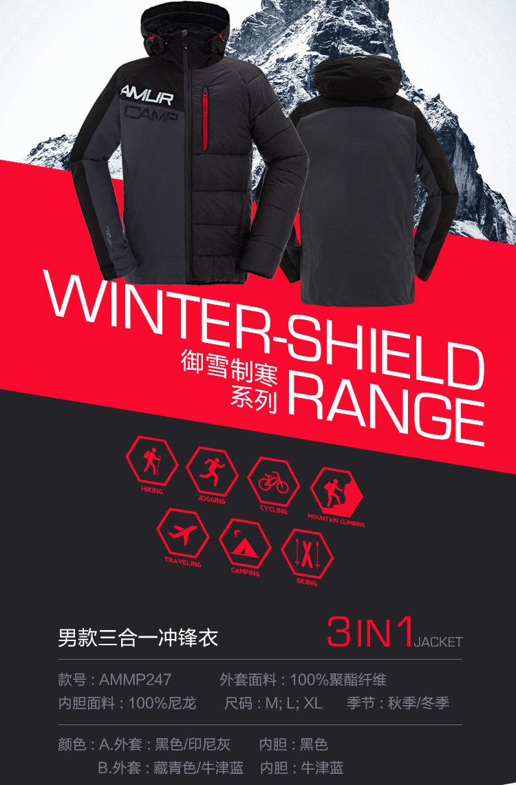 Amurcamp这款三合一棉服,外层10000mm水压、15000mm透湿的防水冲锋衣,防水拉链,接缝全压胶防水处理,防水效果优秀,超出大多数冲锋衣的5000-8000mm水压。里层是棉服内胆,填充120克仿丝棉,保暖效果优于抓绒。
