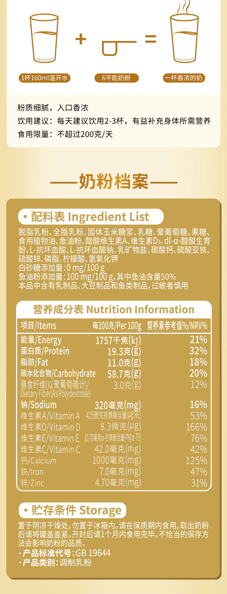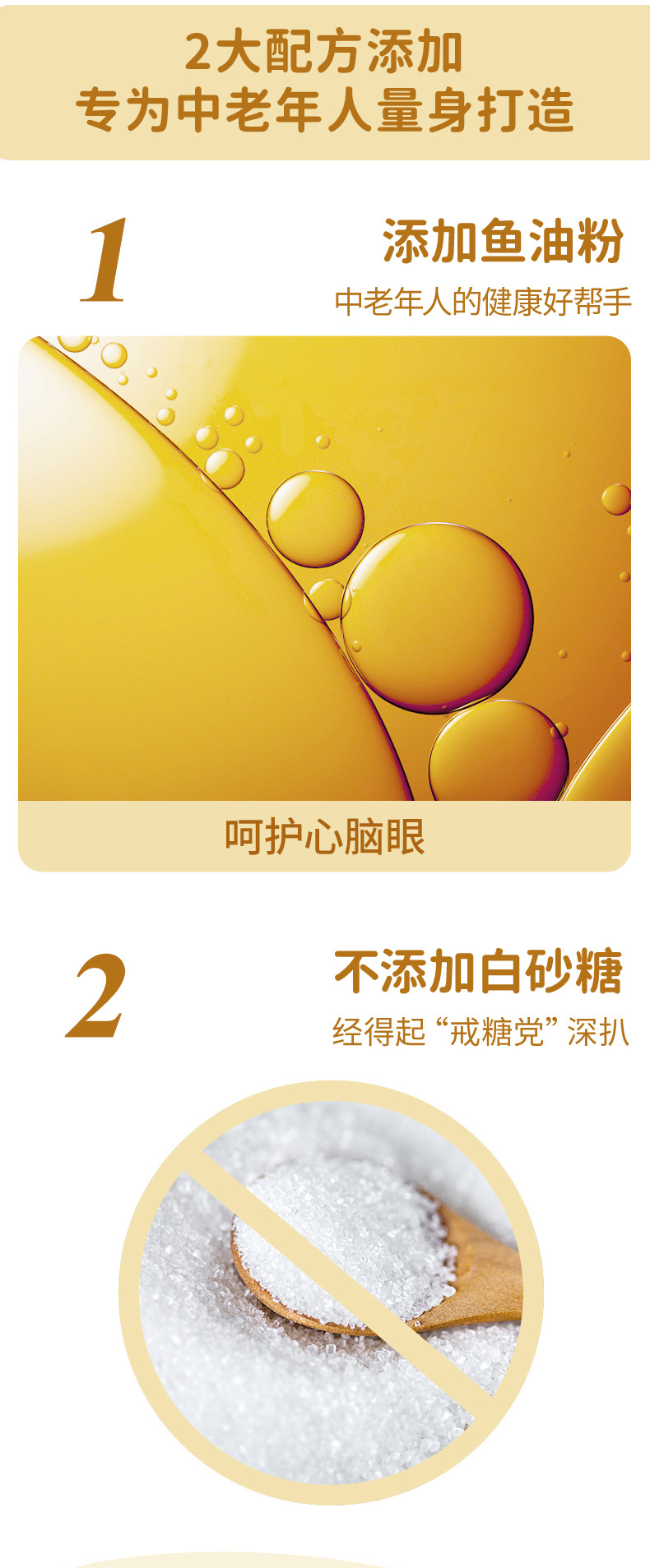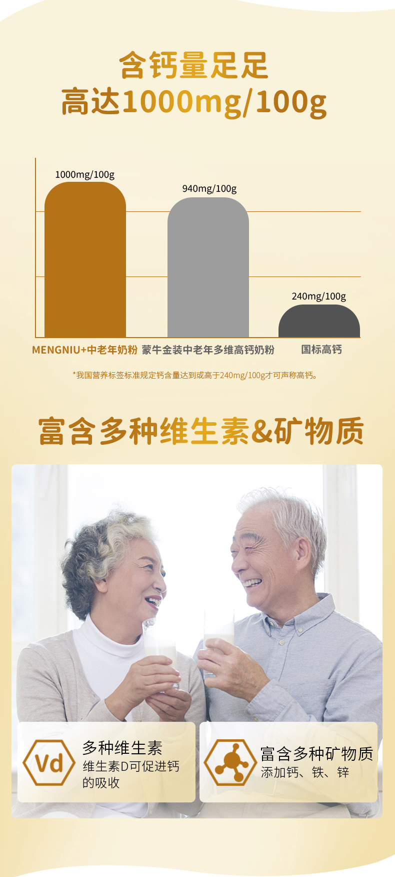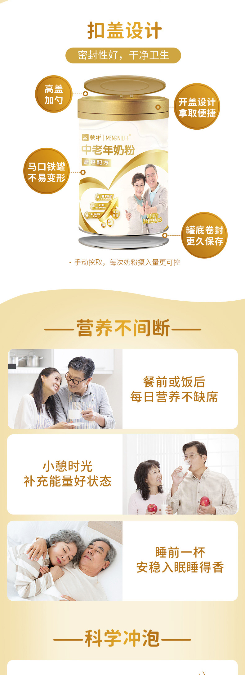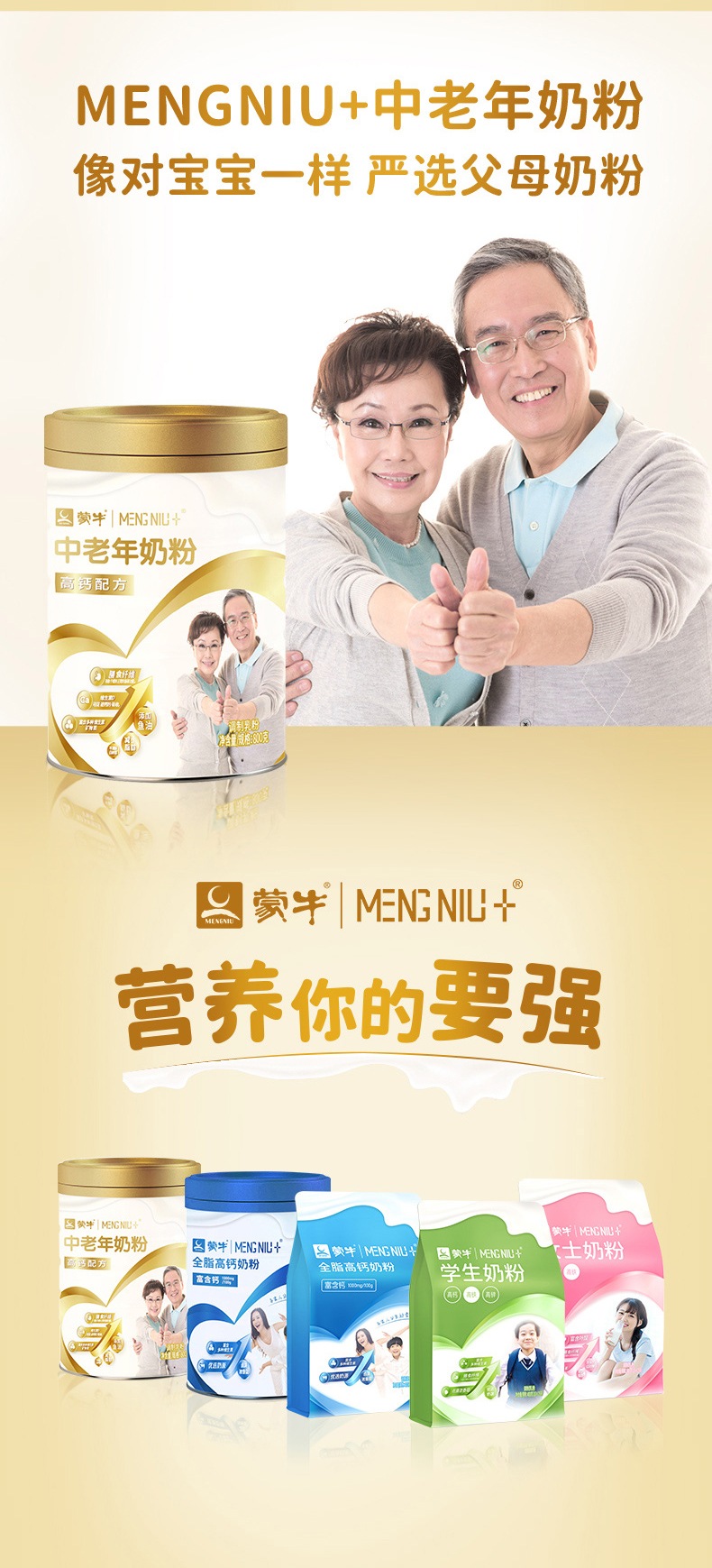 这款奶粉是蒙牛新品,专为中老年人量身打造。9.6倍浓缩高钙、减少58%脂肪,特别添加鱼油粉,膳食纤维、不添加白砂糖,富含多种维生素和矿物质,补充每日机体所需营养,贴心呵护父母健康!
