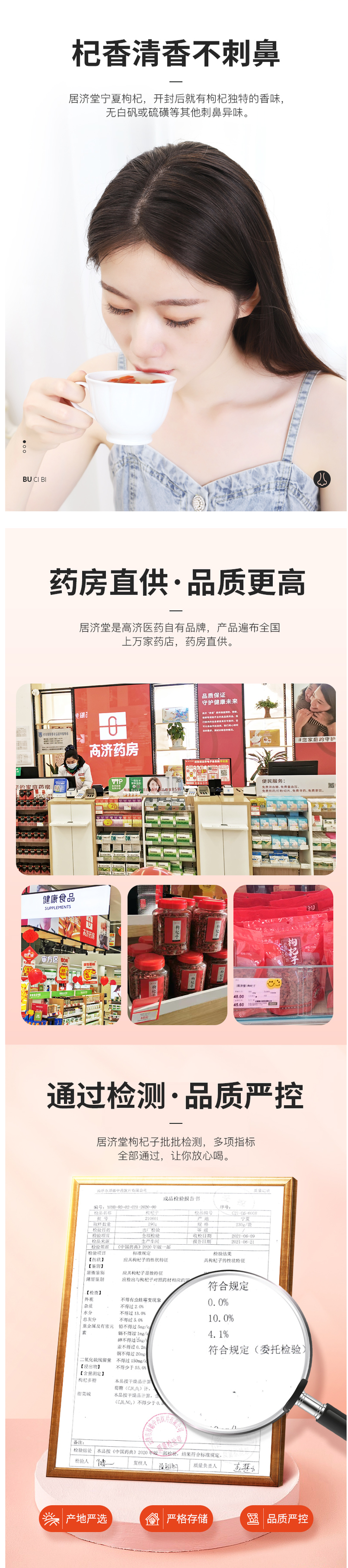这款居济堂特级免洗宁夏枸杞,产地是宁夏的银川市,执行标准:《中华人民共和药典》2020年版一部,药品生产许可证:粤20160574,品质靠谱。