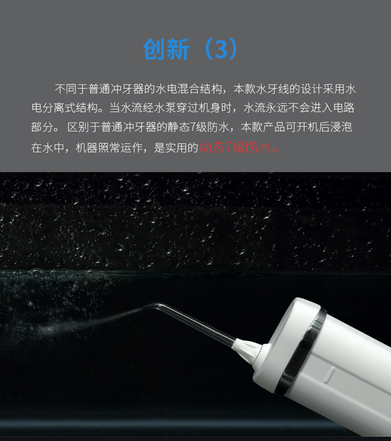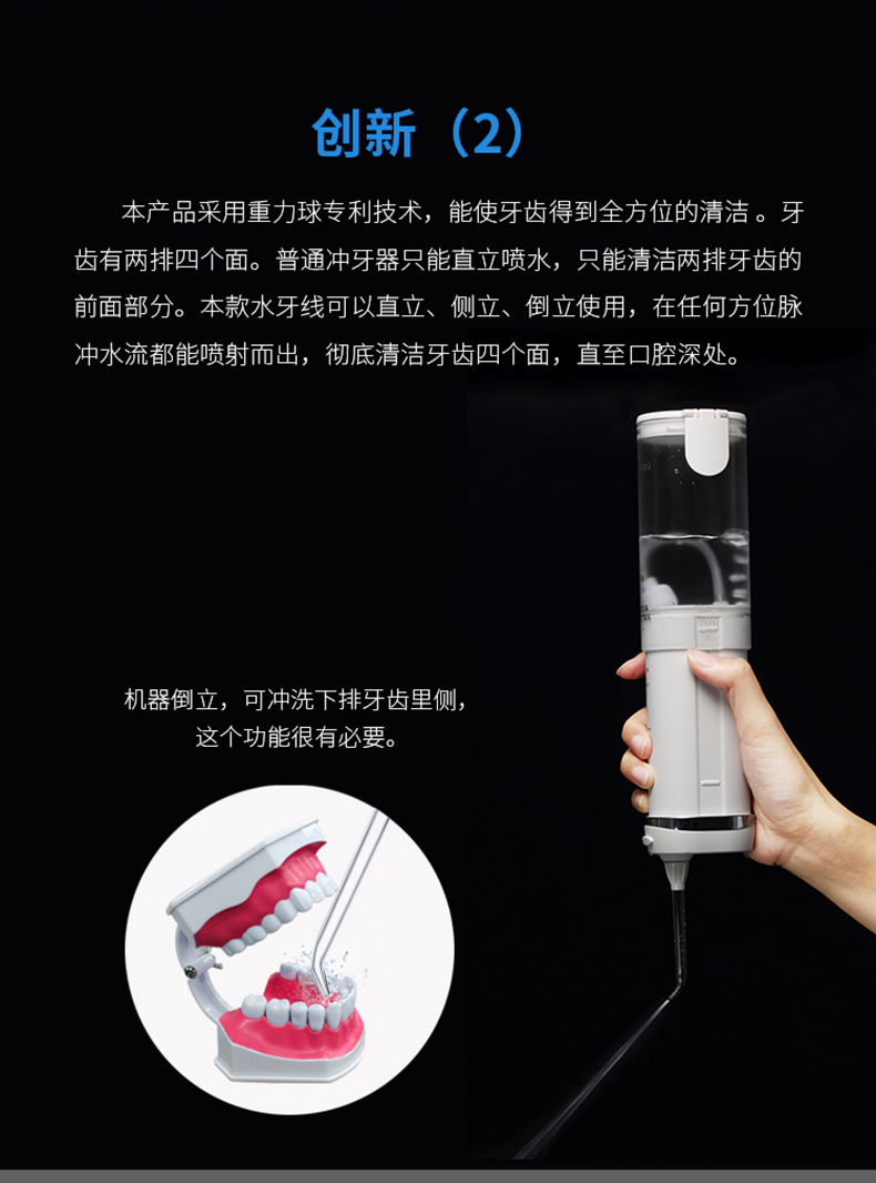 全面升级,日本万宝至马达,可拆卸式水箱,重力球设计,多角度使用,用水无残留。配有标准喷嘴*2、正畸喷嘴*1、牙周袋喷嘴*1、舌刮喷嘴*1.