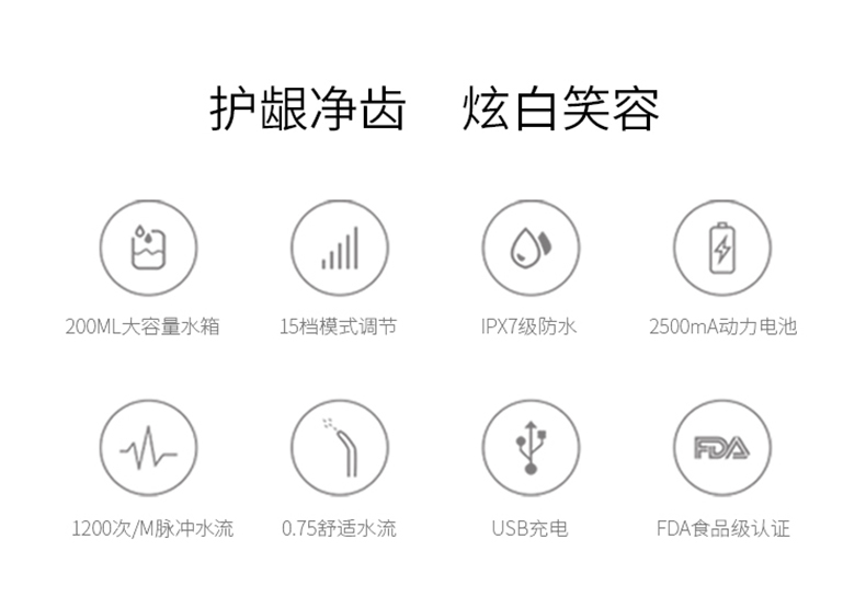 智能芯片精准控压水流,水压高达130PSI,产生1200次/分钟高频脉冲水流,轻松冲洗口腔内残渣污垢。15档位任意挑选,2500毫安超大锂电池,充电一次可以使用60天,IPX7级防水,洗澡淋浴皆可使用,FDA食品级认证。