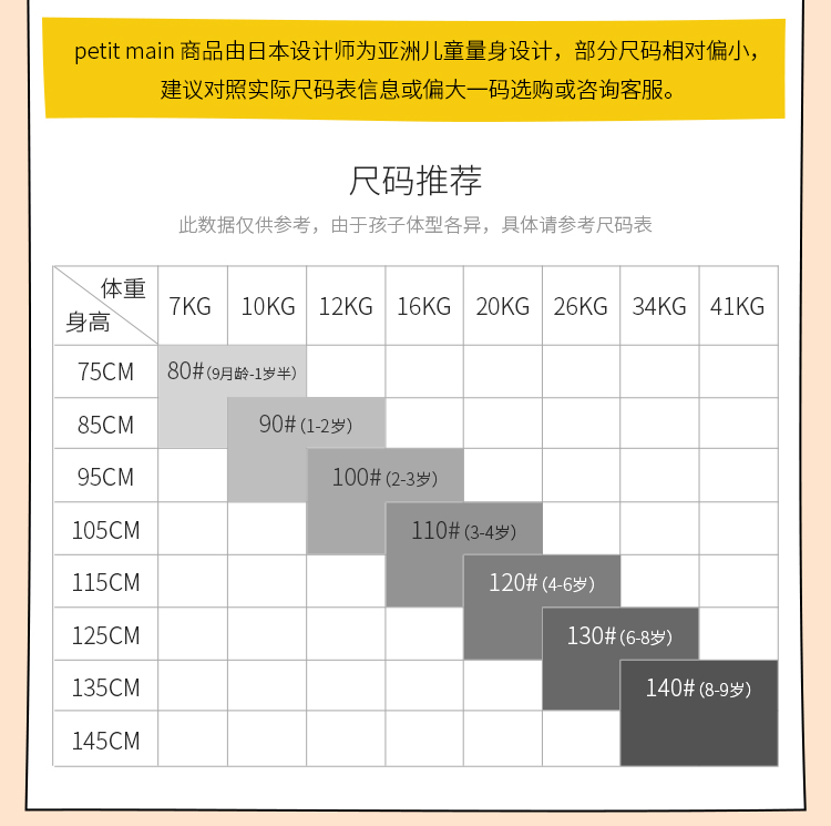 petit main为Narumiya公司旗下主推童装品牌,在日本具有超高人气(日本亚马逊上有售)大型商场百货均有销售。距今已有112年的历史,品牌以“时尚、简约、大牌”为核心理念。将童真融入流行时尚,穿着舒适有范,每季新款都会成为日本人气APP“wear”的晒单王,迄今petitmain已是日本时尚童装的标杆品牌,等到市场高度好评。