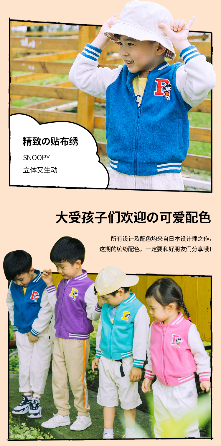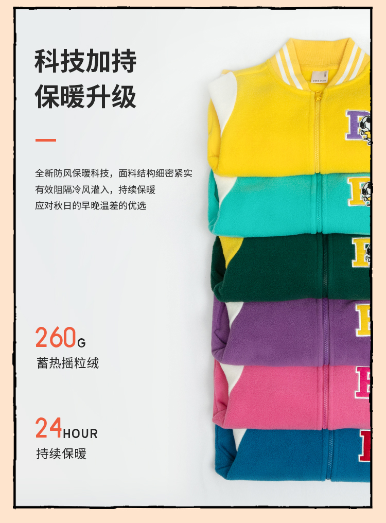 天猫petitmain童装旗舰店129元,可领50元优惠券,实付79元到手,史努比联名系列,柔软摇粒绒,摇粒绒的保暖性是羊毛的2倍、棉花的4倍,同时兼具轻盈透气、柔软亲肤、不易皱、易打理等特点。