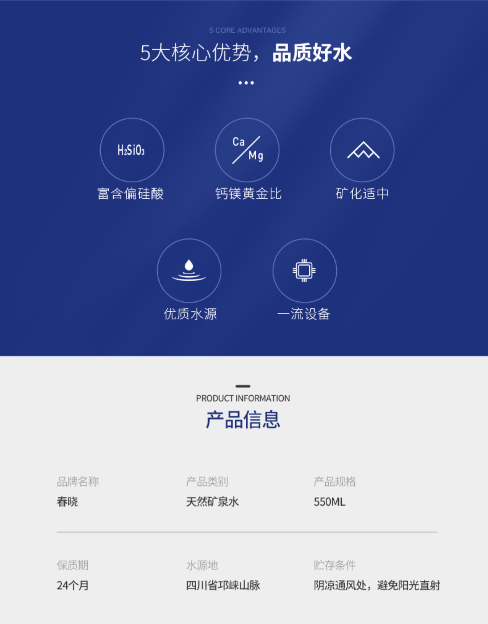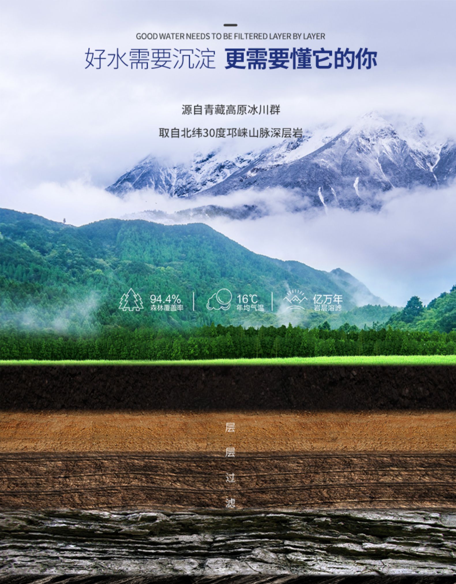 这款春暁的天然矿泉水来自青藏高原的冰川群,取自邛峡山脉的千年雪山,远离城市污染,水源富含偏硅酸、钾、钠、锶、镁等十多种对人体有益的微量元素,水质硬度较小,适合长期饮用。